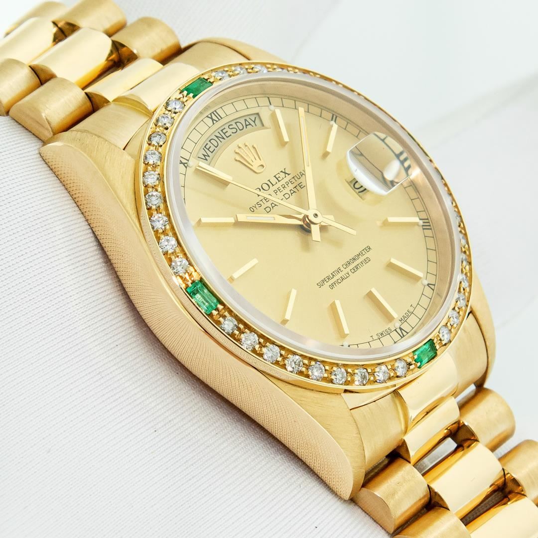 One Mens Pre Owned Quickset Rolex Day Date 18K Yellow Gold President Polished, Serviced & Electronically Tested, Rolex 18K Yellow Gold Case: 36mm, Rolex 18K Yellow Gold Crown, Custom Bezel: New 18K Yellow Gold Beadset Diamond & Emerald Bezel, Diamond Count: 36 Diamonds + 4 Emeralds On Bezel. Custom Crystal: New Sapphire With Magnified Date Window. Rolex Movement: Automatic Quickset Winding Movement Caliber 3055. Rolex Dial: Champagne Index With Roman Track & Lumi Dots. Custom Hands: New Hands. Date Window: 3 O'Clock Position, Day Display: 12 O'Clock Position, Single Quickset, Model: Day Date President. Condition: G-6 Extra Fine. Rolex Bracelet: 18K Yellow Gold President Band With Hidden Clasp, Bright & Satin Polish. 7.0 Inch Length, Standard President Clasp, With Rolex Logo. This Watch Has Been Serviced And Polished It Is Free Of All Scratches And Dents.
