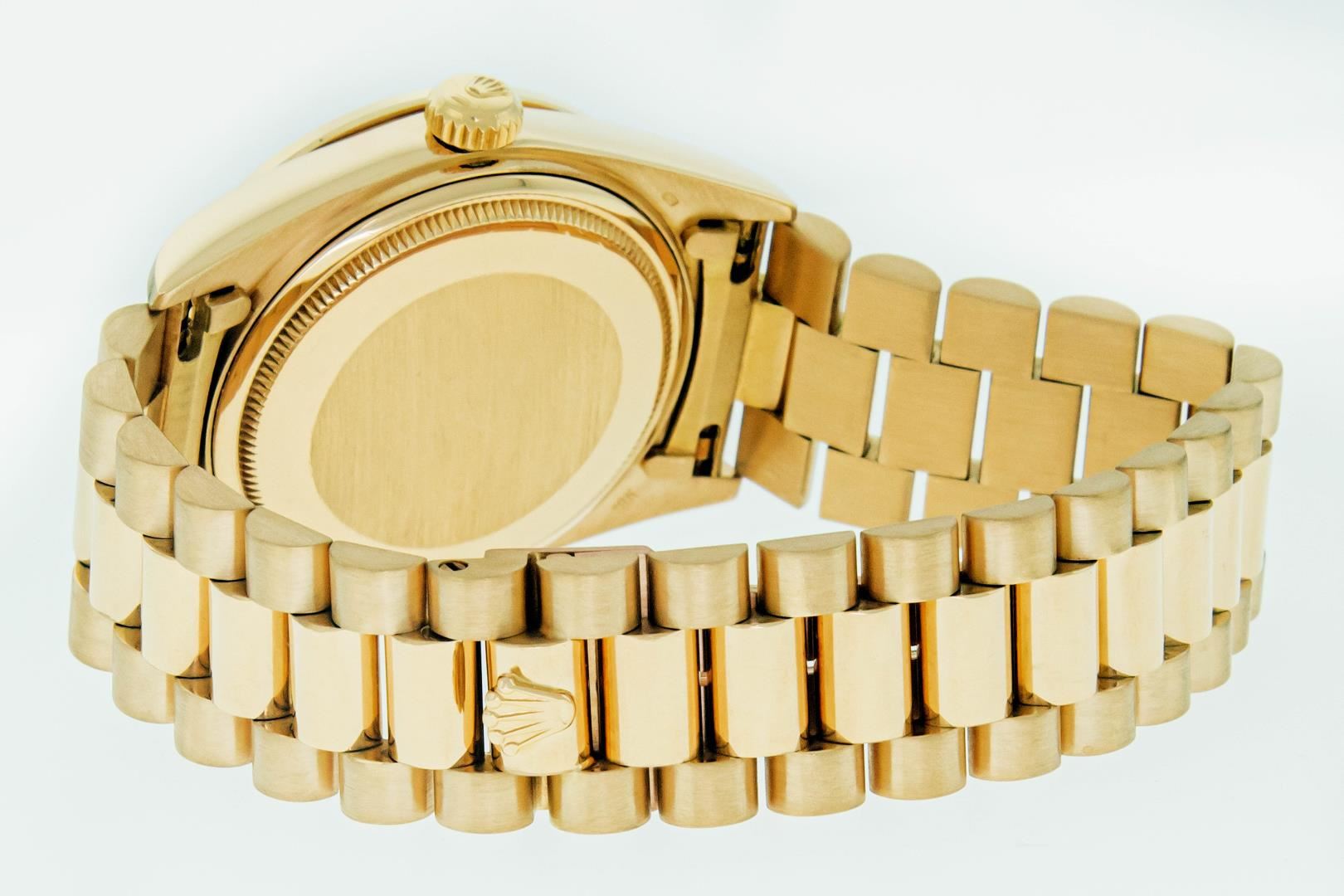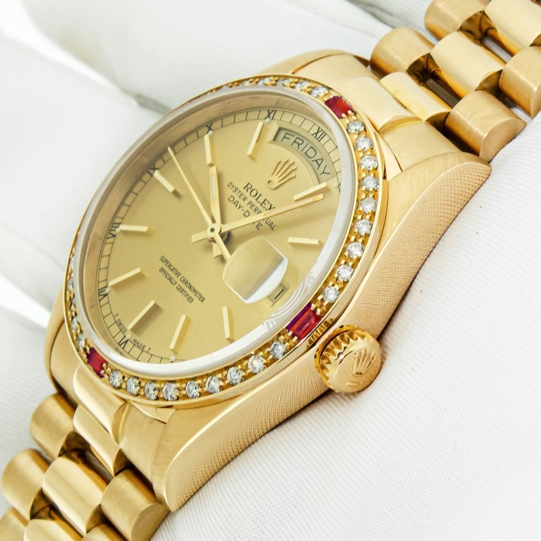 One Mens Pre Owned Quickset Rolex Day Date 18K Yellow Gold President Polished, Serviced & Electronically Tested, Rolex 18K Yellow Gold Case: 36mm, Rolex 18K Yellow Gold Crown, Custom Bezel: New 18K Yellow Gold Beadset Diamond & Ruby Bezel, Diamond Count: 36 Diamonds + 4 Rubies On Bezel. Custom Crystal: New Sapphire With Magnified Date Window. Rolex Movement: Automatic Quickset Winding Movement Caliber 3055. Rolex Dial: Champagne Index With Roman Track & Lumi Dots. Custom Hands: New Hands. Date Window: 3 O'Clock Position, Day Display: 12 O'Clock Position, Single Quickset, Model: Day Date President. Condition: G-6 Extra Fine. Rolex Bracelet: 18K Yellow Gold President Band With Hidden Clasp, Bright & Satin Polish. 7.0 Inch Length, Standard President Clasp, With Rolex Logo. This Watch Has Been Serviced And Polished It Is Free Of All Scratches And Dents.