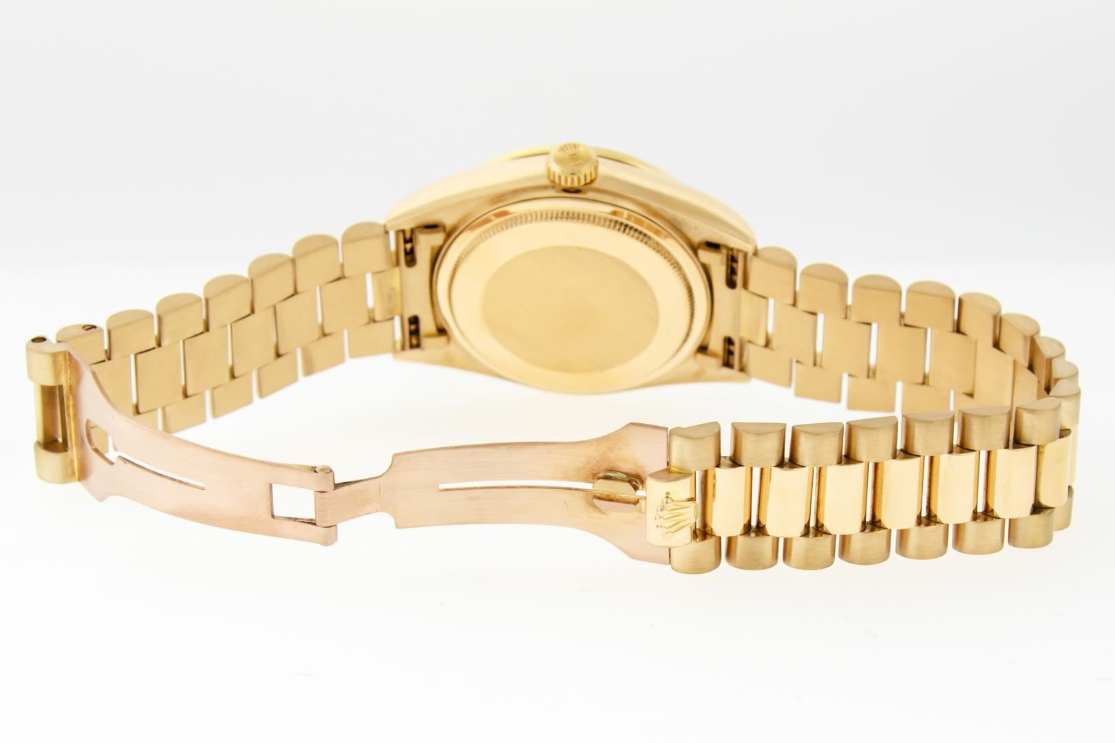 One Mens Pre Owned Rolex Day Date 18K Yellow Gold President Polished, Serviced & Electronically Tested, Rolex 18K Yellow Gold Case: 36mm, Rolex 18K Yellow Gold Crown, Custom Bezel: New 18K Yellow Gold Diamond Bezel + Sapphires, Diamond Count 36 Diamonds + 4 Sapphires On Bezel, Clarity: SI-VS, Color: G to H. Custom Crystal: New Sapphire With Magnified Date Window. Custom Hands: New Luminescent Hands. Rolex Movement: Automatic Winding Movement Caliber 3055. Rolex Dial: Factory Champagne Diamond Dial, Diamond Count: 8 Diamonds + 2 Baguettes, Clarity: VS. Date Window: 3 O'Clock Position Date Display, Day Window: 12 O'Clock Position Date Display. Quickset, Model: Day Date President. Condition: G-6 Extra Fine. Rolex Bracelet: New 18K Yellow Gold President Band. Bright Polish. 7.0 Inch Length, Standard Hidden President Clasp President Band, With Rolex Logo. This Watch Has Been Serviced And Polished It Is Free Of All Scratches And Dents.