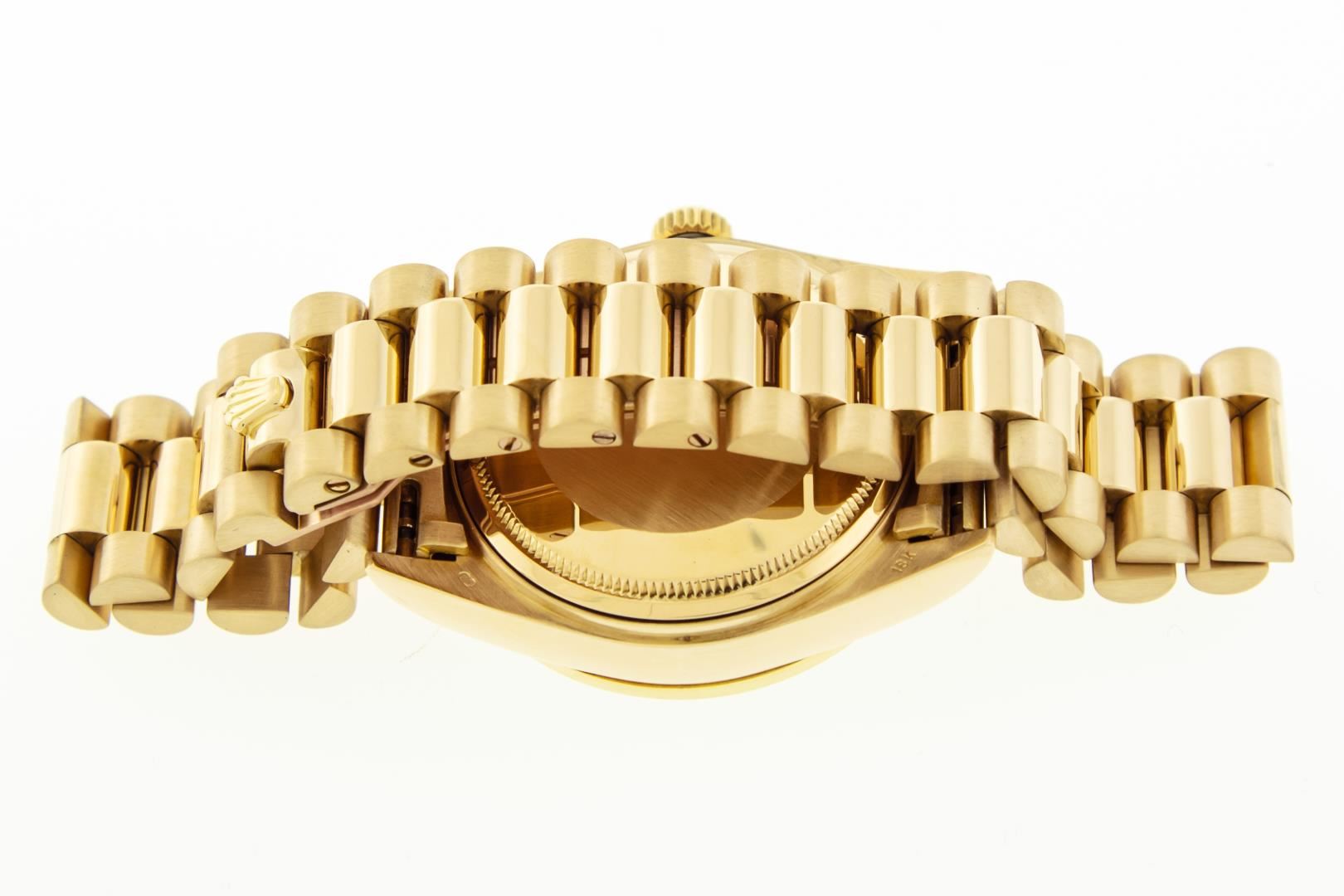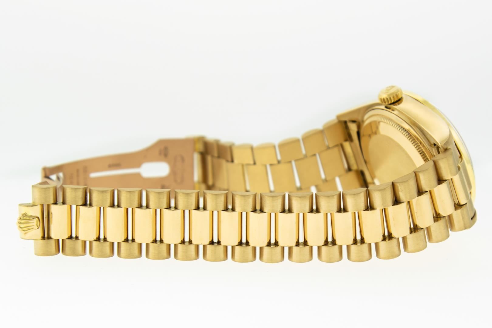 One Mens Pre Owned Rolex Day Date 18K Yellow Gold President Polished, Serviced & Electronically Tested, Rolex 18K Yellow Gold Case: 36mm, Rolex 18K Yellow Gold Crown, Custom Bezel: New 18K Yellow Gold Diamond Bezel + Sapphires, Diamond Count 36 Diamonds + 4 Sapphires On Bezel, Clarity: SI-VS, Color: G to H. Custom Crystal: New Sapphire With Magnified Date Window. Custom Hands: New Luminescent Hands. Rolex Movement: Automatic Winding Movement Caliber 3055. Rolex Dial: Factory Champagne Diamond Dial, Diamond Count: 8 Diamonds + 2 Baguettes, Clarity: VS. Date Window: 3 O'Clock Position Date Display, Day Window: 12 O'Clock Position Date Display. Quickset, Model: Day Date President. Condition: G-6 Extra Fine. Rolex Bracelet: New 18K Yellow Gold President Band. Bright Polish. 7.0 Inch Length, Standard Hidden President Clasp President Band, With Rolex Logo. This Watch Has Been Serviced And Polished It Is Free Of All Scratches And Dents.
