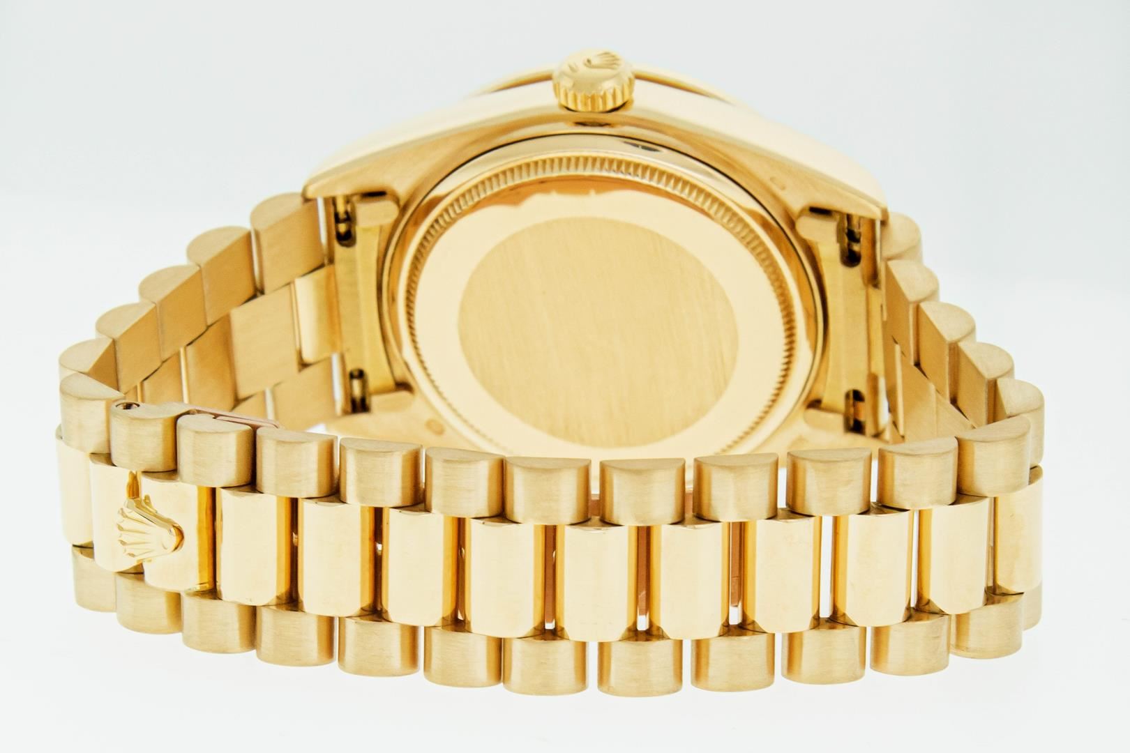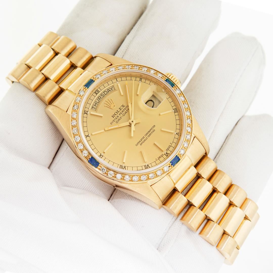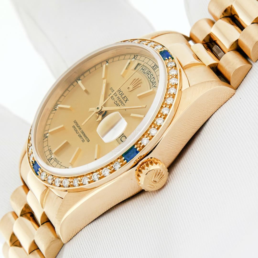 One Mens Pre Owned Quickset Rolex Day Date 18K Yellow Gold President Polished, Serviced & Electronically Tested, Rolex 18K Yellow Gold Case: 36mm, Rolex 18K Yellow Gold Crown, Custom Bezel: New 18K Yellow Gold Beadset Diamond & Sapphire Bezel, Diamond Count: 36 Diamonds + 4 Sapphires On Bezel. Custom Crystal: New Sapphire With Magnified Date Window. Rolex Movement: Automatic Quickset Winding Movement Caliber 3055. Rolex Dial: Champagne Index With Roman Track & Lumi Dots. Custom Hands: New Hands. Date Window: 3 O'Clock Position, Day Display: 12 O'Clock Position, Single Quickset, Model: Day Date President. Condition: G-6 Extra Fine. Rolex Bracelet: 18K Yellow Gold President Band With Hidden Clasp, Bright & Satin Polish. 7.0 Inch Length, Standard President Clasp, With Rolex Logo. This Watch Has Been Serviced And Polished It Is Free Of All Scratches And Dents.