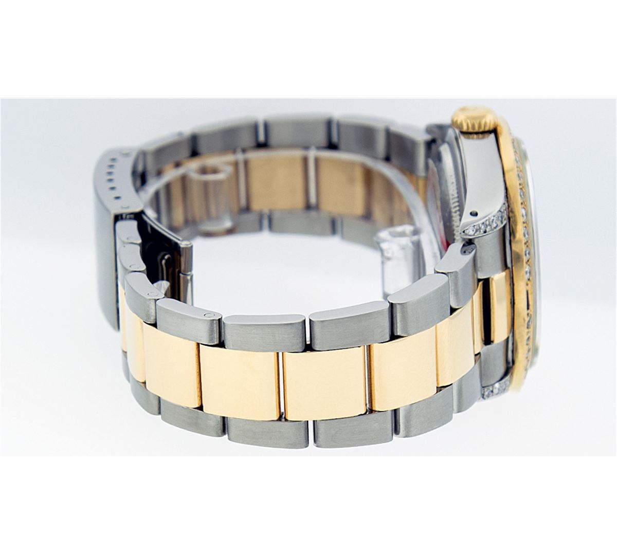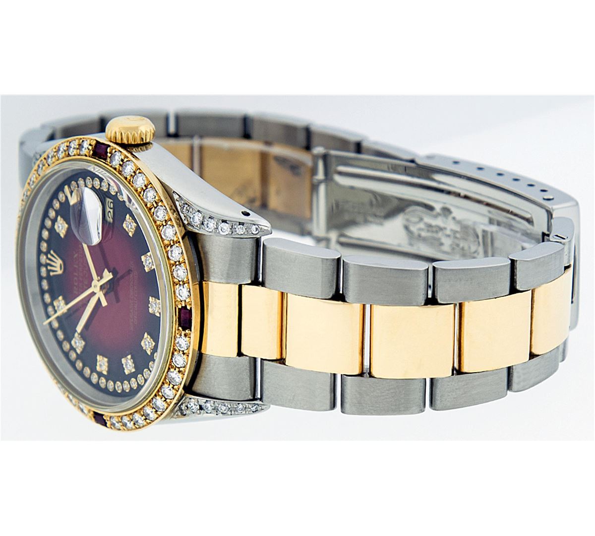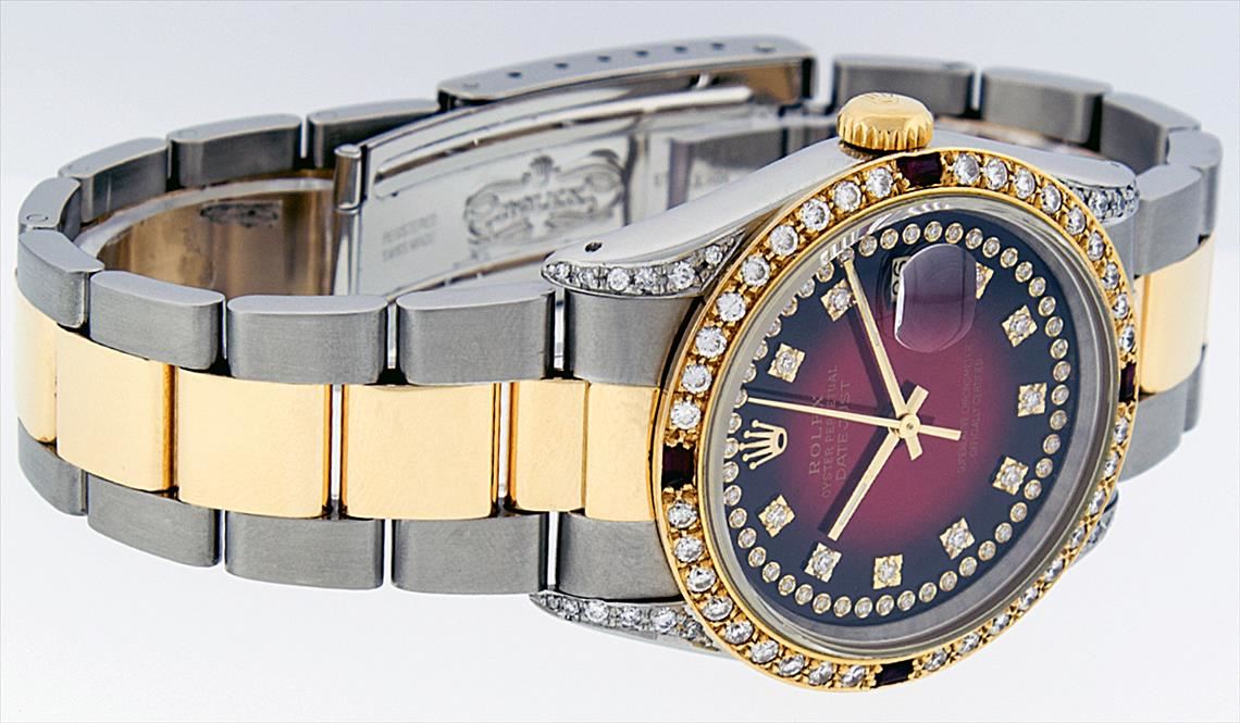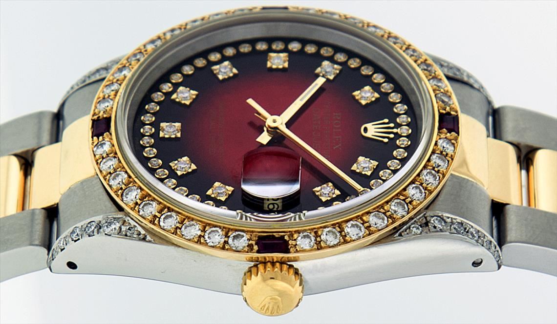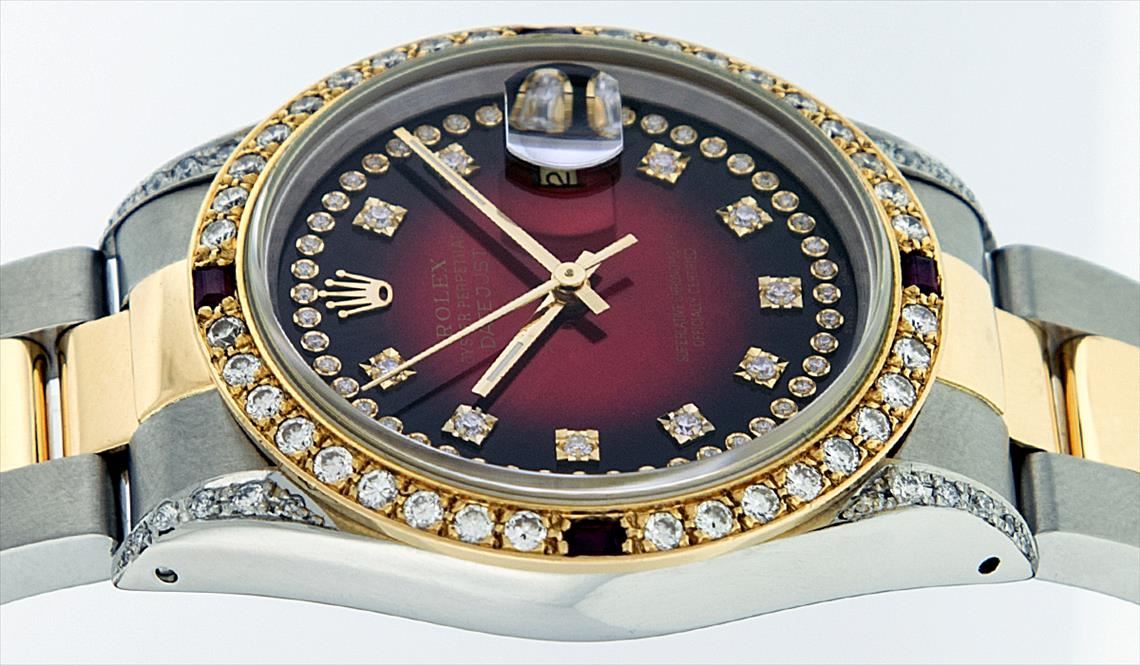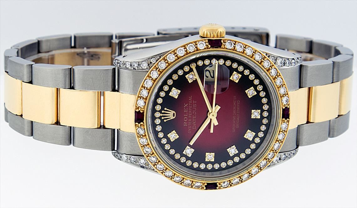 One Gents 18K Yellow Gold Two Tone Rolex Datejust Polished, Serviced & Electronically Tested, 18K Yellow Gold & Stainless Steel Case:36mm, Diamond Lugs On Case, Diamond Count: 16 Diamonds On Lugs, Color: G To H, Clarity: SI-VS. 18K Yellow Gold Crown, Custom Bezel: 18K Yellow Gold Ruby Beadset Diamond Bezel, Diamond Count: 36 Diamonds + 4 Rubies. Total Weight 1.00 Carat, Clarity: Si-VS, Color: G to H. Custom Crystal: Synthetic Sapphire Cyclops Lens. Movement: Automatic Winding Movement Caliber 3135. Custom Dial: Red Vignette String Diamond Dial VVS, Diamond Count: 58 Diamonds In Dial, Color: G To H, Clarity: VVS, Date Window: 3 O'Clock Position Date Display, Quickset, Model: 16233 Condition: G-6 Extra Fine The Watch Is In Very Good Condition Free Of All Scratches And Dents. Bracelet: Two Tone 18K Yellow Gold & Stainless Steel Oyster Band. Bright Polish. 7.0 Inch Length, Adjustable. Standard Clasp, With Rolex Logo.