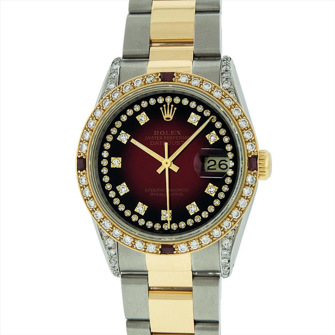 One Gents 18K Yellow Gold Two Tone Rolex Datejust Polished, Serviced & Electronically Tested, 18K Yellow Gold & Stainless Steel Case:36mm, Diamond Lugs On Case, Diamond Count: 16 Diamonds On Lugs, Color: G To H, Clarity: SI-VS. 18K Yellow Gold Crown, Custom Bezel: 18K Yellow Gold Ruby Beadset Diamond Bezel, Diamond Count: 36 Diamonds + 4 Rubies. Total Weight 1.00 Carat, Clarity: Si-VS, Color: G to H. Custom Crystal: Synthetic Sapphire Cyclops Lens. Movement: Automatic Winding Movement Caliber 3135. Custom Dial: Red Vignette String Diamond Dial VVS, Diamond Count: 58 Diamonds In Dial, Color: G To H, Clarity: VVS, Date Window: 3 O'Clock Position Date Display, Quickset, Model: 16233 Condition: G-6 Extra Fine The Watch Is In Very Good Condition Free Of All Scratches And Dents. Bracelet: Two Tone 18K Yellow Gold & Stainless Steel Oyster Band. Bright Polish. 7.0 Inch Length, Adjustable. Standard Clasp, With Rolex Logo.