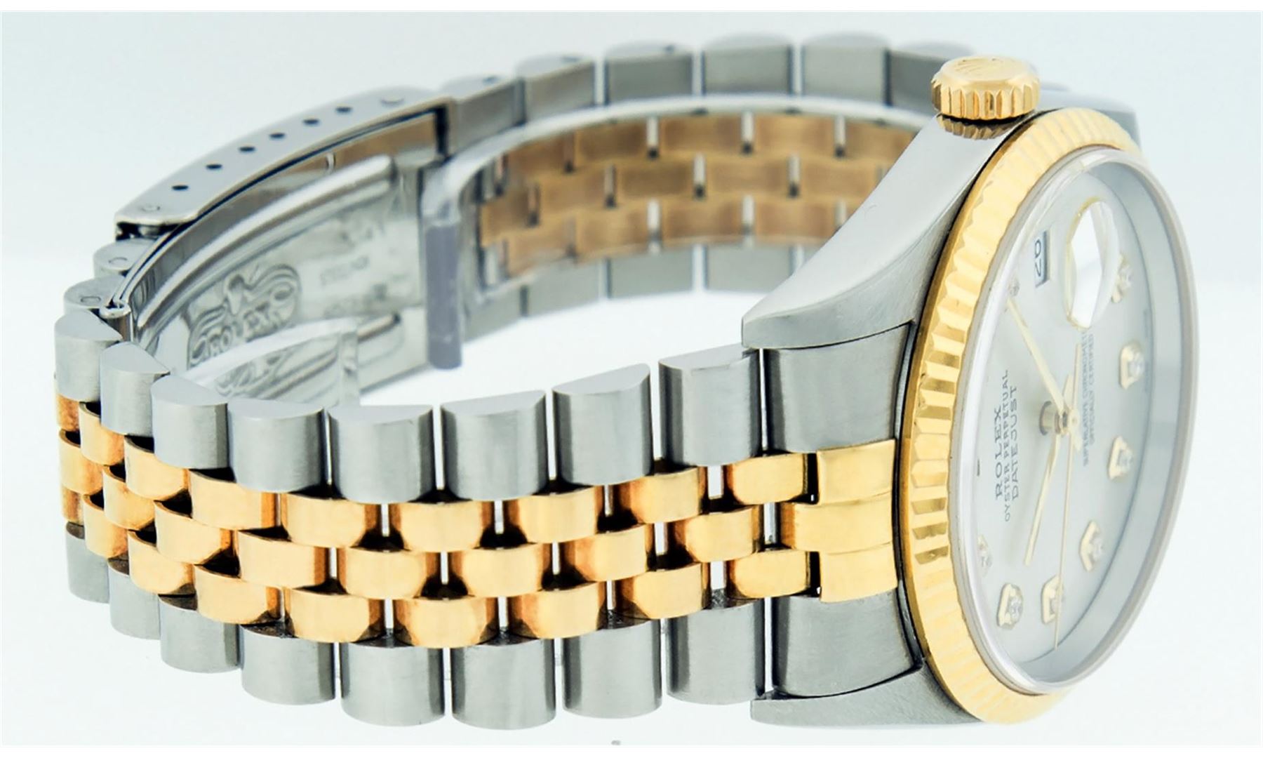 One Gents 18K Yellow Gold Two Tone Rolex Datejust Polished, Serviced & Electronically Tested, 18K Yellow Gold & Stainless Steel Case:36mm. Bezel: 18K Yellow Gold Fluted Bezel. Custom Crystal: Synthetic Sapphire Cyclops Lens. Movement: Automatic Winding Movement Caliber 3135. Custom Dial: Slate Grey Diamond Dial, Diamond Count: 10 Diamonds In Dial, Color: G To H, Clarity: SI-VS, Date Window: 3 O'Clock Position Date Display, Quickset, Model: 16233 Condition: G-6 Extra Fine. This is a no hole case. The Watch Is In Very Good Condition Free Of All Scratches And Dents. Bracelet: Two Tone 18K Yellow Gold & Stainless Steel Jubilee Band. Bright Polish. 7.0 Inch Length, Adjustable. Standard Clasp, With Rolex Logo.