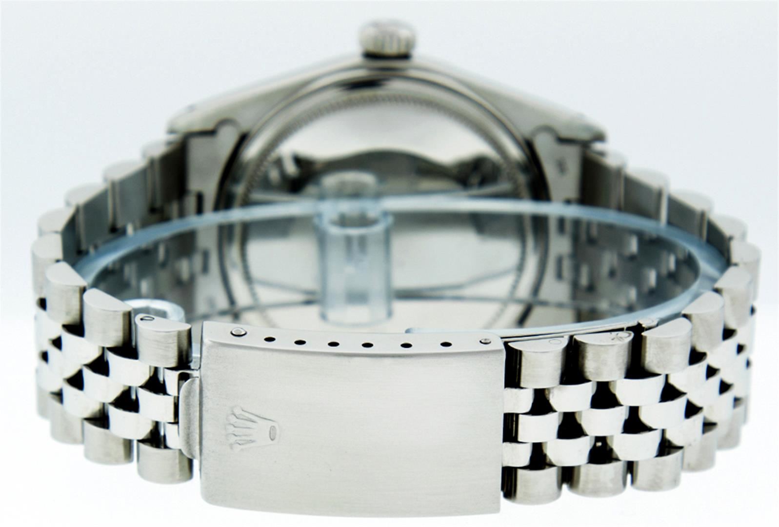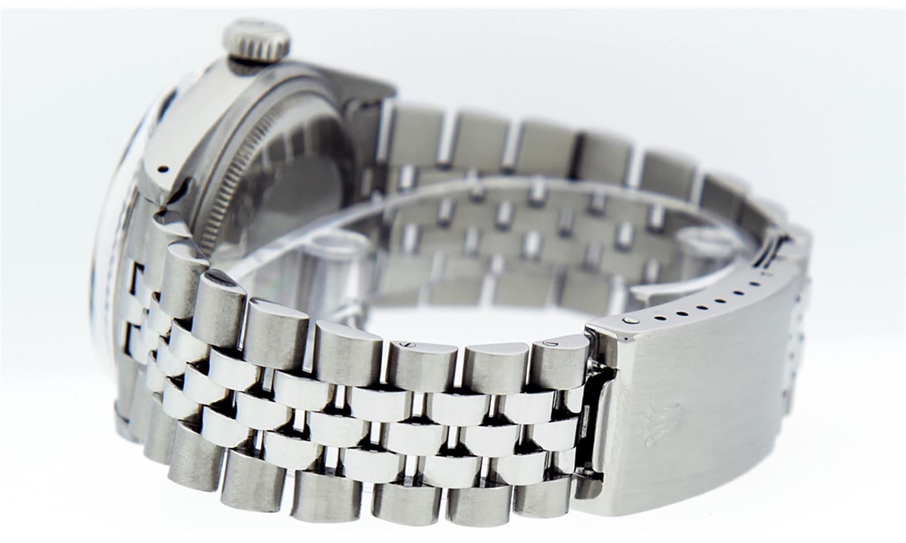 One Gents Rolex Datejust Polished Bright with Satin Finish, Serviced & Electronically Tested, Stainless Steel Case:36mm, Stainless Steel Crown, Bezel: 14K White Gold Fluted Bezel. Custom Crystal: Acrylic Cyclops Lens. Movement: Automatic Winding Movement Caliber 3035. Custom Dial: Black Diamond Dial With Line Track, Diamond Count: 10 Diamond in Dial G To H In Color, SI-VS Clarity. Date Window: 3 O'Clock Position Date Display, Quickset, Model: Datejust, Condition: G-6 Extra Fine. Bracelet: Stainless Steel Jubilee. Bright Polish & Satin Finish. 7.0 Inch Length, Adjustable. Standard Clasp, With Rolex Logo.