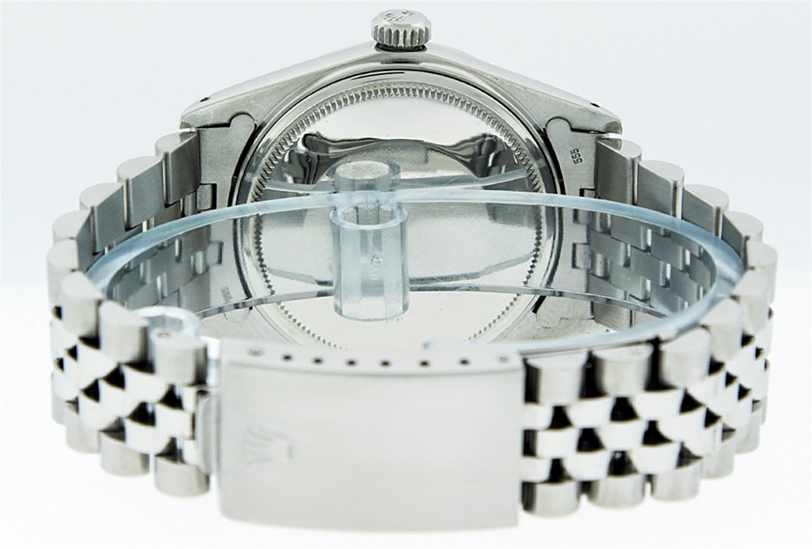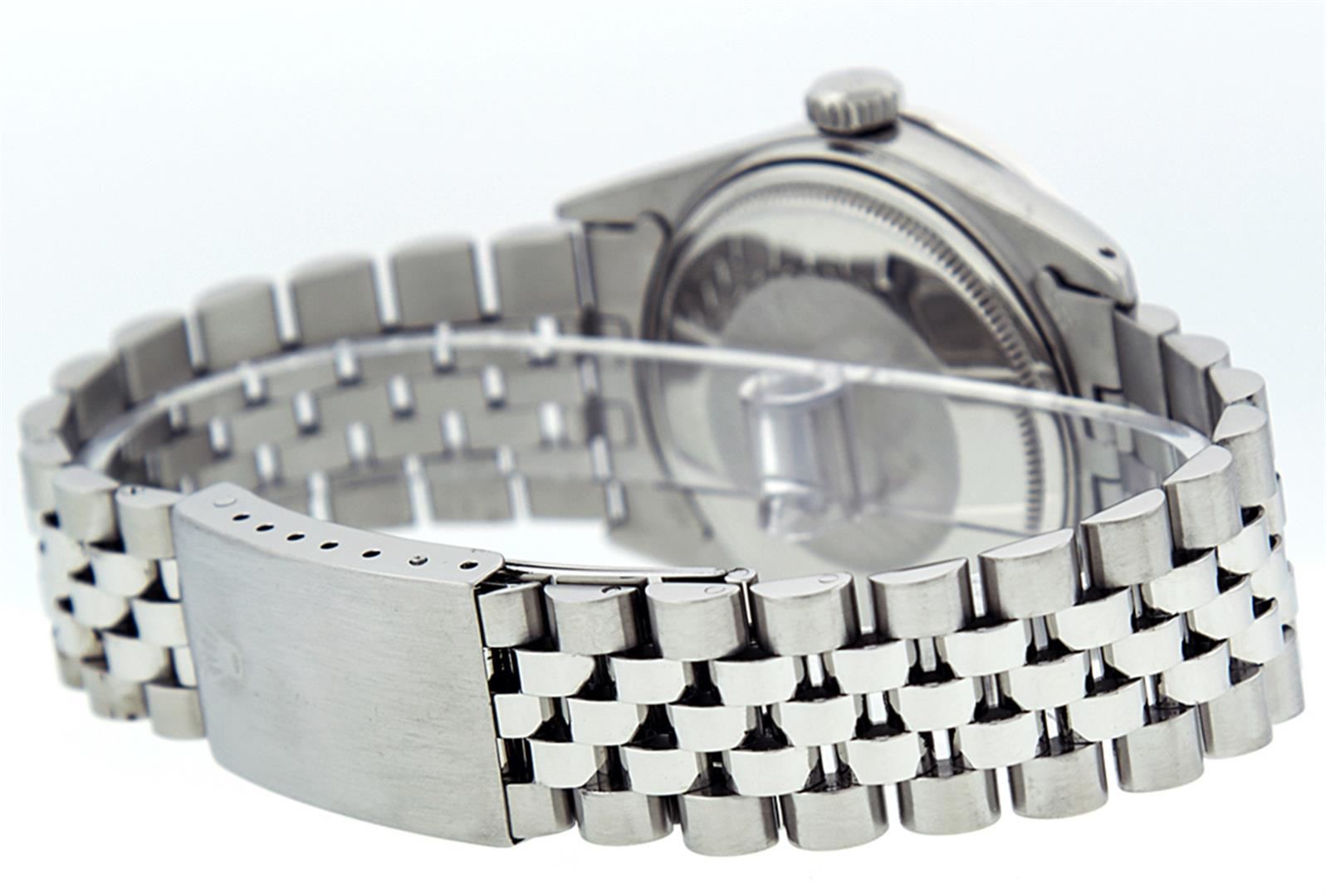 One Gents Rolex Datejust Polished Bright with Satin Finish, Serviced & Electronically Tested, Stainless Steel Case:36mm, Stainless Steel Crown, Bezel: 14K White Gold Fluted Bezel. Custom Crystal: Acrylic Cyclops Lens. Movement: Automatic Winding Movement Caliber 3035. Custom Dial: Black Baguette Diamond 8 + 2 Emerald Dial, Stone Count: 8 Baguette Diamonds in Dial + 2 Emerald Baguettes G To H In Color, SI-VS Clarity. Date Window: 3 O'Clock Position Date Display, Quickset, Model: Datejust, Condition: G-6 Extra Fine. Bracelet: Stainless Steel Jubilee. Bright Polish & Satin Finish. 7.0 Inch Length, Adjustable. Standard Clasp, With Rolex Logo. Watch Has Been Serviced And Polished It Is Free Of All Scratches And Dents.