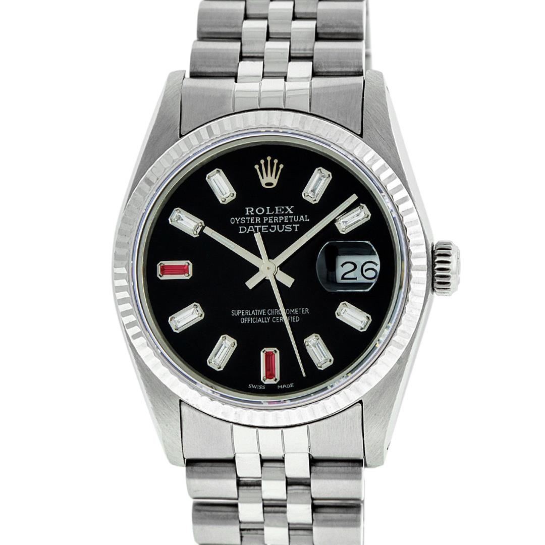 One Gents Rolex Datejust Polished Bright with Satin Finish, Serviced & Electronically Tested, Stainless Steel Case:36mm, Stainless Steel Crown, Bezel: 14K White Gold Fluted Bezel. Custom Crystal: Acrylic Cyclops Lens. Movement: Automatic Winding Movement Caliber 3035. Custom Dial: Black Baguette Diamond 8 + 2 Ruby, Stone Count: 8 Baguette Diamonds in Dial + 2 Ruby Baguettes G To H In Color, SI-VS Clarity. Date Window: 3 O'Clock Position Date Display, Quickset, Model: Datejust, Condition: G-6 Extra Fine. Bracelet: Stainless Steel Jubilee. Bright Polish & Satin Finish. 7.0 Inch Length, Adjustable. Standard Clasp, With Rolex Logo. Watch Has Been Serviced And Polished It Is Free Of All Scratches And Dents.