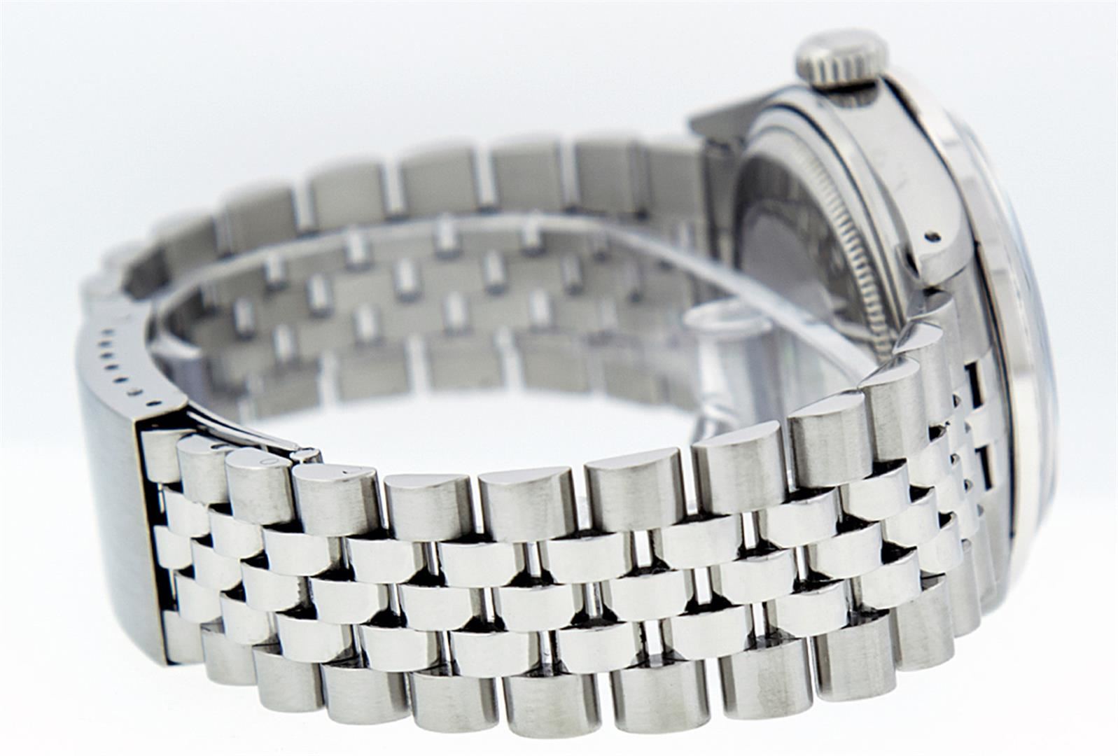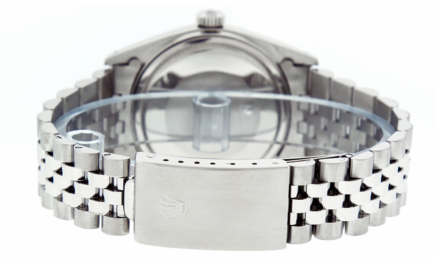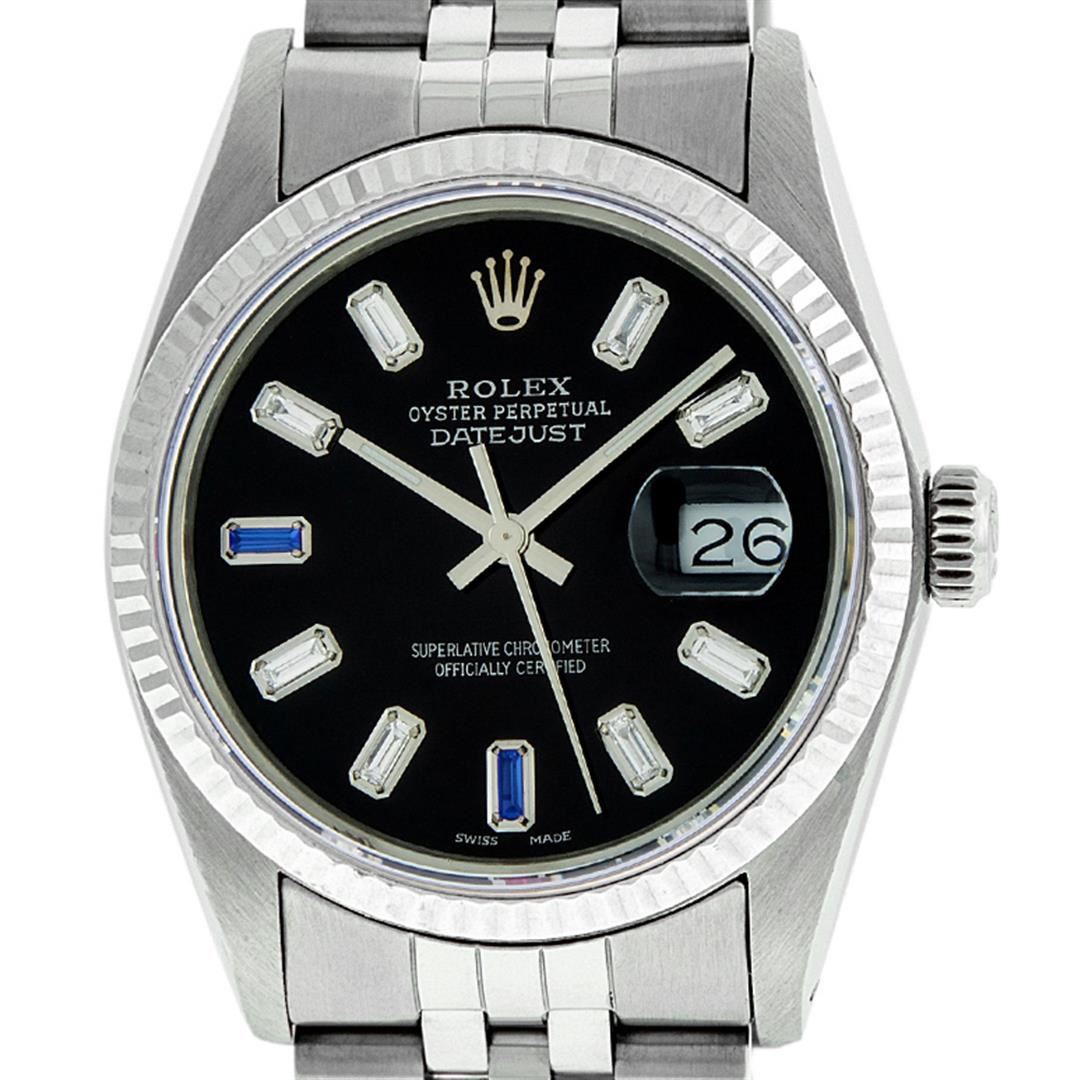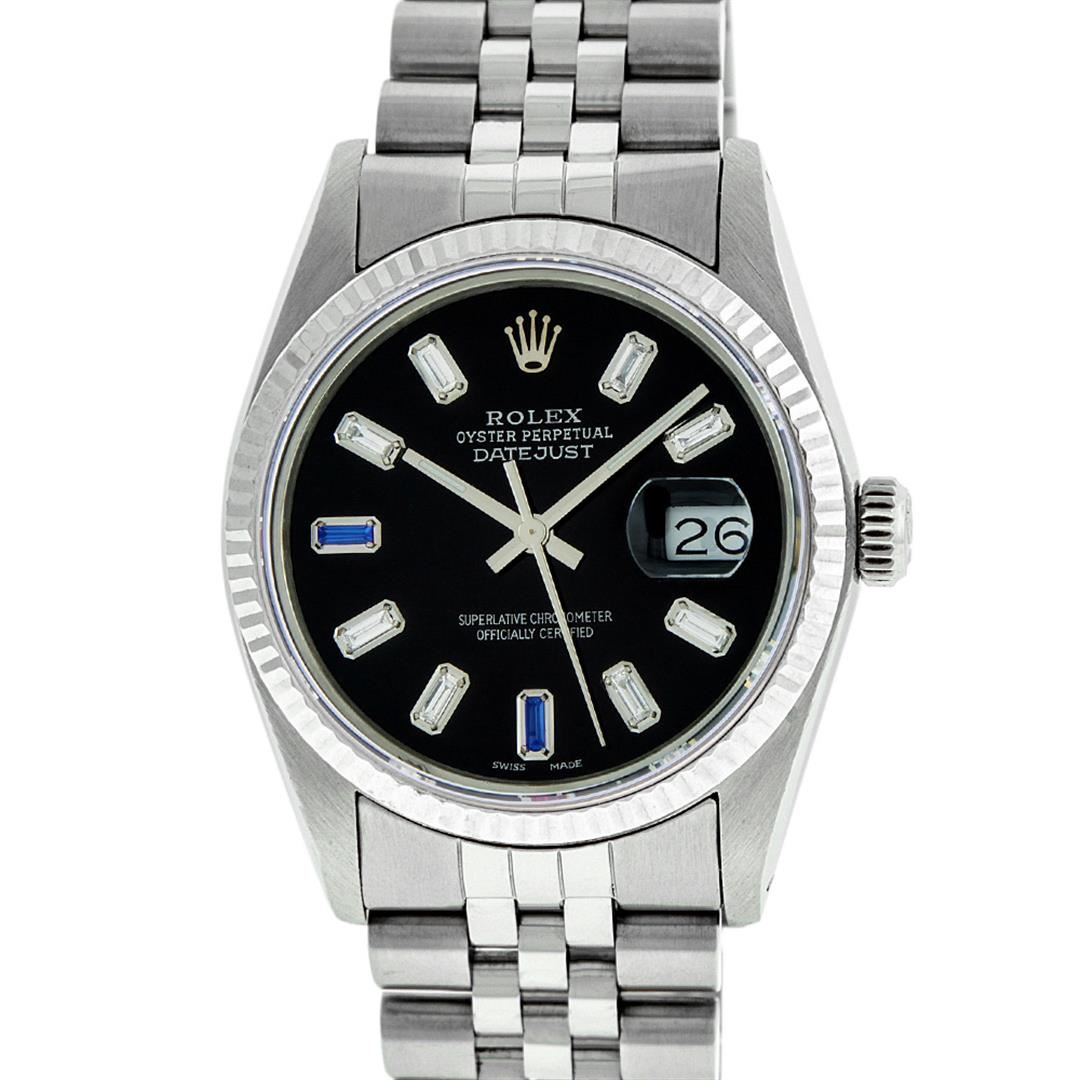 One Gents Rolex Datejust Polished Bright with Satin Finish, Serviced & Electronically Tested, Stainless Steel Case:36mm, Stainless Steel Crown, Bezel: 14K White Gold Fluted Bezel. Custom Crystal: Acrylic Cyclops Lens. Movement: Automatic Winding Movement Caliber 3035. Custom Dial: Black Baguette Diamond 8 + 2 Sapphire, Stone Count: 8 Baguette Diamonds in Dial + 2 Sapphire Baguettes G To H In Color, SI-VS Clarity. Date Window: 3 O'Clock Position Date Display, Quickset, Model: Datejust, Condition: G-6 Extra Fine. Bracelet: Stainless Steel Jubilee. Bright Polish & Satin Finish. 7.0 Inch Length, Adjustable. Standard Clasp, With Rolex Logo. Watch Has Been Serviced And Polished It Is Free Of All Scratches And Dents.