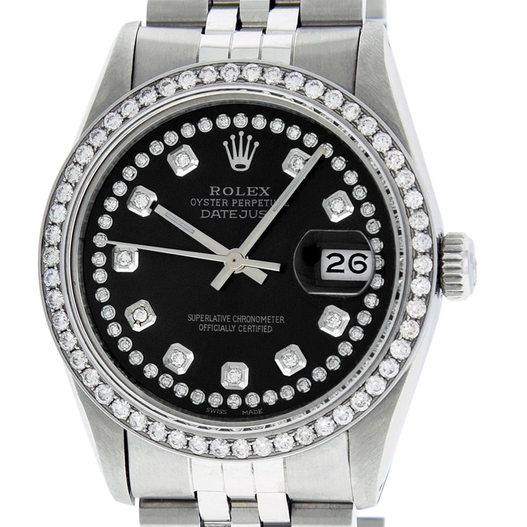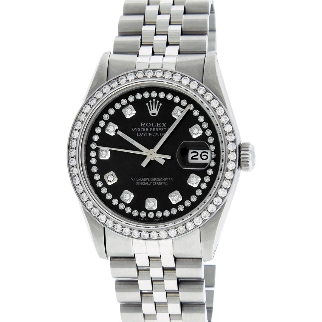 One Mens Rolex Datejust Polished Bright with Satin Finish, Serviced & Electronically Tested, Stainless Steel Case:36mm, Stainless Steel Crown, Custom Bezel: Stainless Steel Beadset Diamond Bezel, Diamond Count: 54 Diamonds Total Weight 1.00 Carat, Clarity: SI-VS, Color: G to H. Custom Crystal: Synthetic Sapphire Cyclops Lens. Movement: Automatic Winding Movement Caliber 3035. Custom Dial: Black String Diamond Dial, Diamond Count: 58 Diamonds In Dial, Color: G to H, Clarity: VS2-SI1. Date Window: 3 O'Clock Position Date Display, Quickset, Model: Datejust. Condition: G-6 Extra Fine. Bracelet: Stainless Steel Jubilee Band. Bright Polish & Satin Finish. 7.0 Inch Length, Adjustable. Standard Clasp, With Rolex Logo. This watch has been serviced time tested and is in excellent condition it is free of all scratches and dents.