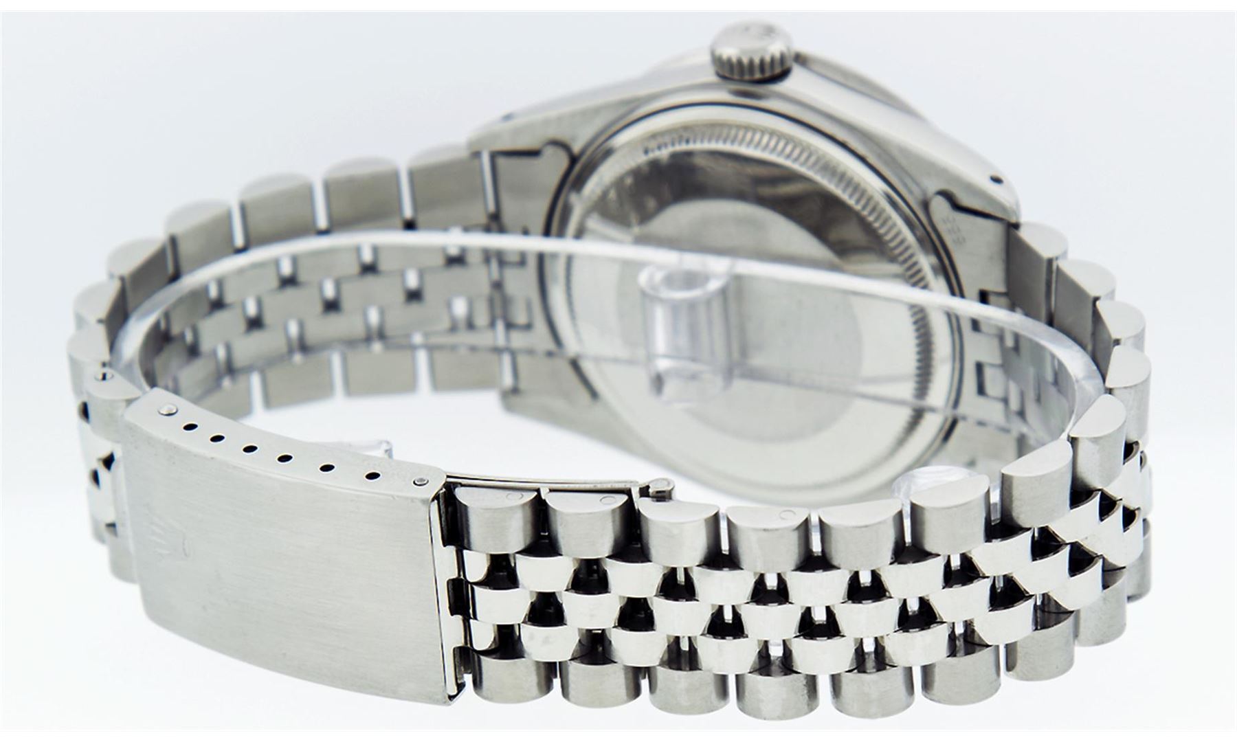 One Mens Rolex Datejust Polished Bright with Satin Finish, Serviced & Electronically Tested, Stainless Steel Case:36mm, Stainless Steel Crown, Custom Bezel: Stainless Steel Beadset Diamond Bezel, Diamond Count: 54 Diamonds Total Weight 1.00 Carat, Clarity: SI-VS, Color: G to H. Custom Crystal: Synthetic Sapphire Cyclops Lens. Movement: Automatic Winding Movement Caliber 3035. Custom Dial: Blue String Diamond Dial, Diamond Count: 58 Diamonds In Dial, Color: G to H, Clarity: VS2-SI1. Date Window: 3 O'Clock Position Date Display, Quickset, Model: Datejust. Condition: G-6 Extra Fine. Bracelet: Stainless Steel Jubilee Band. Bright Polish & Satin Finish. 7.0 Inch Length, Adjustable. Standard Clasp, With Rolex Logo. This watch has been serviced time tested and is in excellent condition it is free of all scratches and dents.