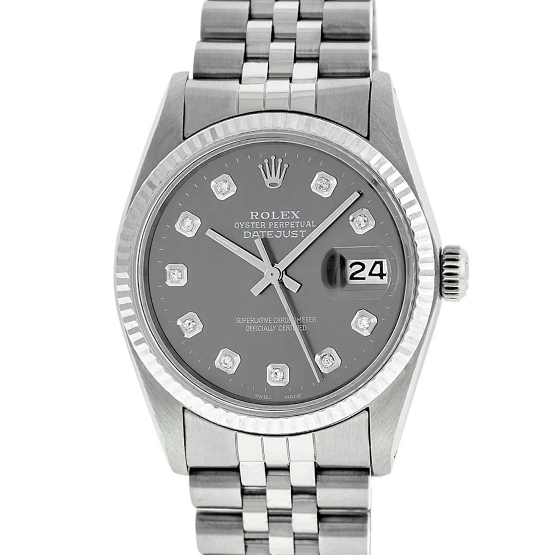 One Gents Rolex Datejust Polished Bright with Satin Finish, Serviced & Electronically Tested, Stainless Steel Case:36mm, Stainless Steel Crown, Bezel: 14K White Gold Fluted Bezel. Custom Crystal: Acrylic Cyclops Lens. Movement: Automatic Winding Movement Caliber 3035. Custom Dial: Dark Rhodium Diamond Dial With Line Track, Diamond Count: 10 Diamond in Dial G To H In Color, SI-VS Clarity. Date Window: 3 O'Clock Position Date Display, Quickset, Model: Datejust, Condition: G-6 Extra Fine. Bracelet: Stainless Steel Jubilee. Bright Polish & Satin Finish. 7.0 Inch Length, Adjustable. Standard Clasp, With Rolex Logo. Watch Has Been Serviced And Polished It Is Free Of All Scratches And Dents.