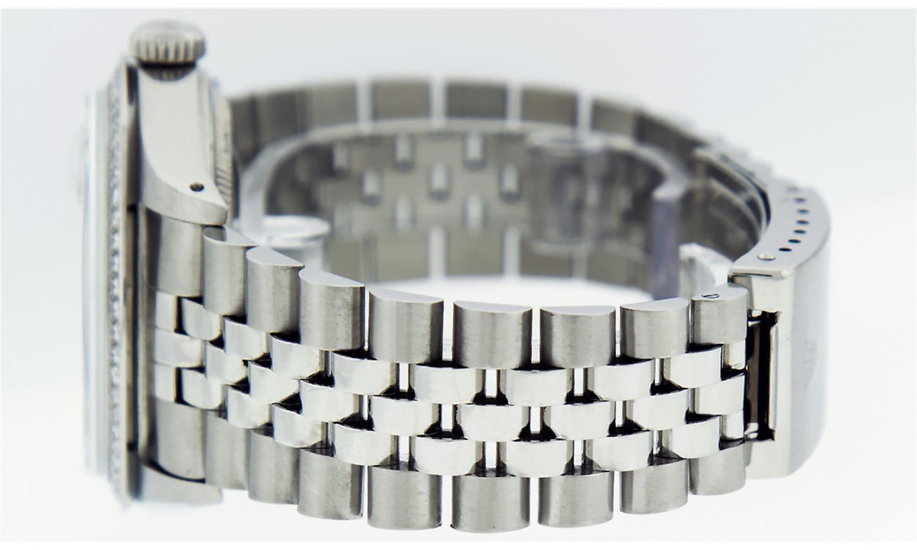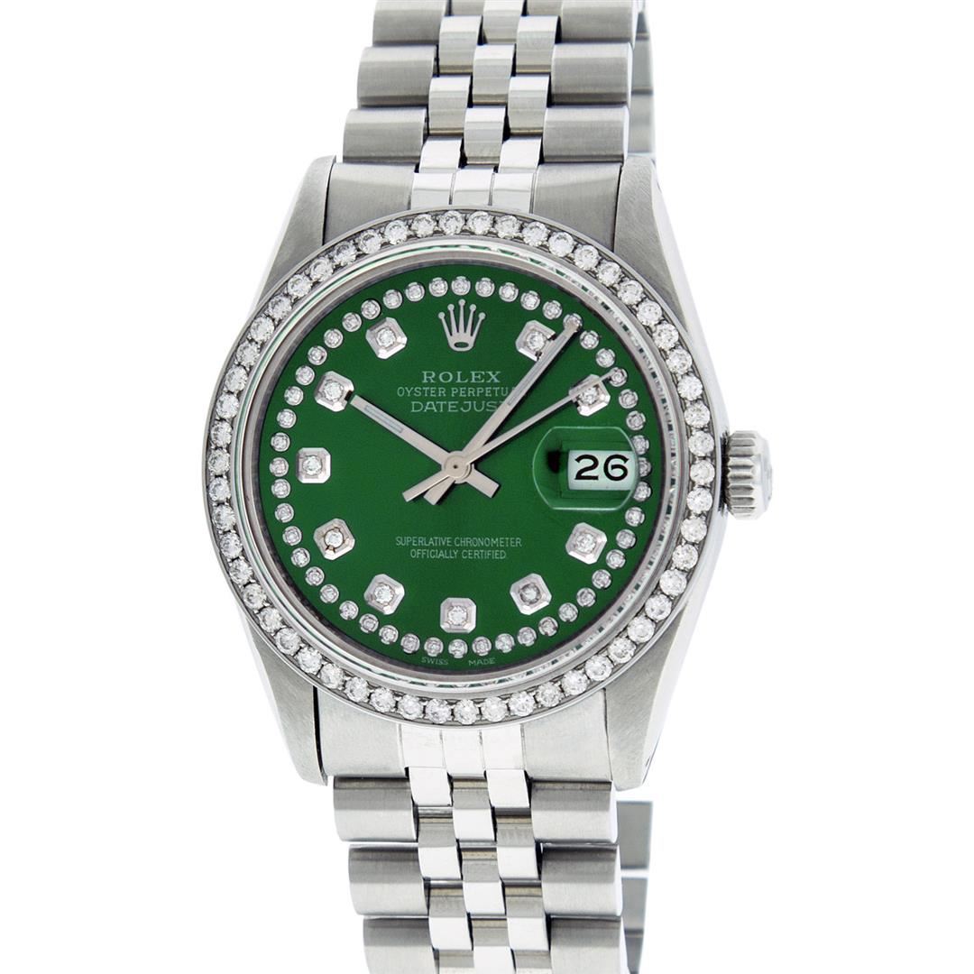 One Mens Rolex Datejust Polished Bright with Satin Finish, Serviced & Electronically Tested, Stainless Steel Case:36mm, Stainless Steel Crown, Custom Bezel: Stainless Steel Beadset Diamond Bezel, Diamond Count: 54 Diamonds Total Weight 1.00 Carat, Clarity: SI-VS, Color: G to H. Custom Crystal: Synthetic Sapphire Cyclops Lens. Movement: Automatic Winding Movement Caliber 3035. Custom Dial: Green String Diamond Dial, Diamond Count: 58 Diamonds In Dial, Color: G to H, Clarity: VS2-SI1. Date Window: 3 O'Clock Position Date Display, Quickset, Model: Datejust. Condition: G-6 Extra Fine. Bracelet: Stainless Steel Jubilee Band. Bright Polish & Satin Finish. 7.0 Inch Length, Adjustable. Standard Clasp, With Rolex Logo. This watch has been serviced time tested and is in excellent condition it is free of all scratches and dents.