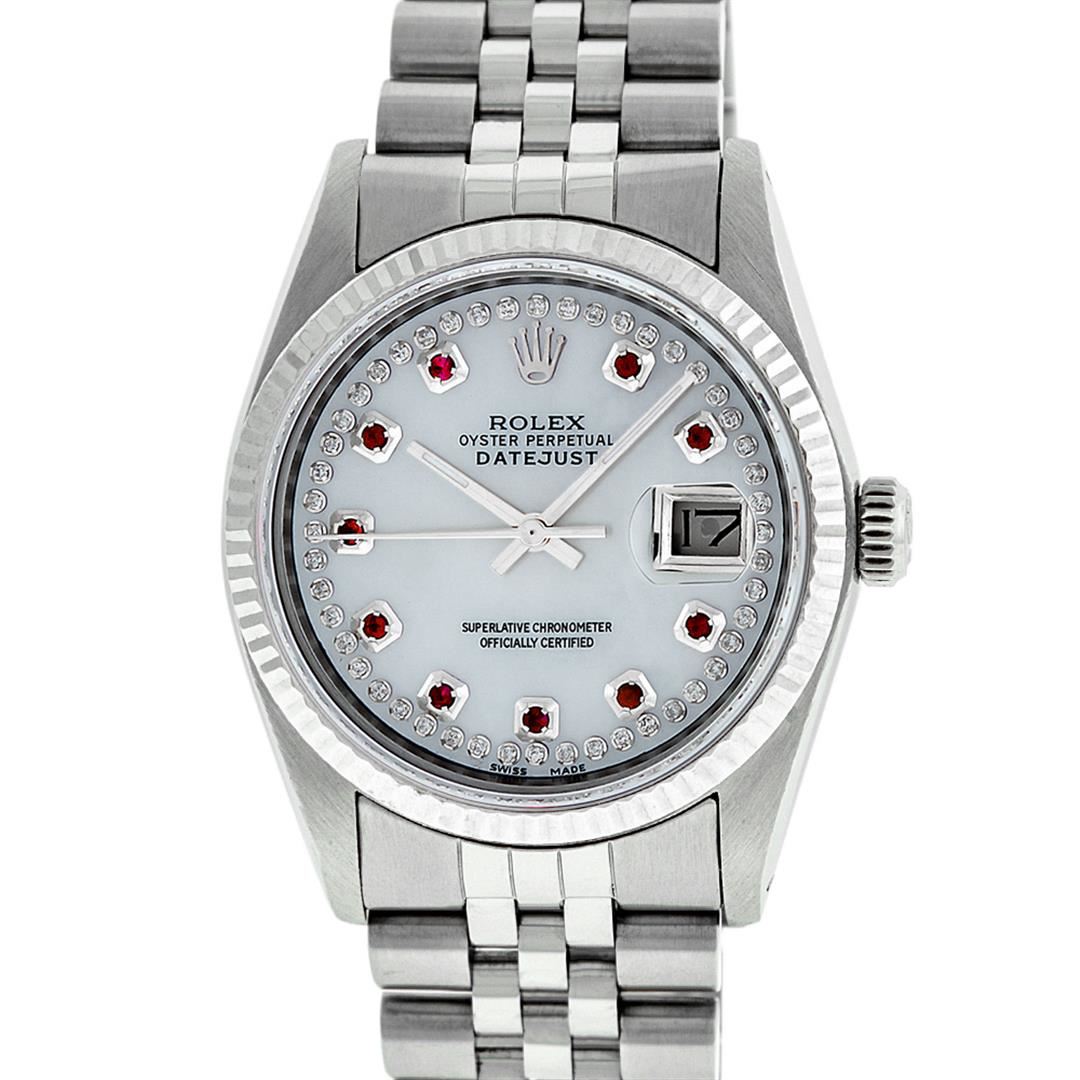One Gents Rolex Datejust Polished Bright with Satin Finish, Serviced & Electronically Tested, Stainless Steel Case:36mm, Stainless Steel Crown, Bezel: 14K White Gold Fluted Bezel. Custom Crystal: Acrylic Cyclops Lens. Movement: Automatic Winding Movement Caliber 3035. Custom Dial: Mother Of Pearl Ruby String Diamond Dial, Stone Count: 10 Rubies + 48 Diamond in Dial G To H In Color, SI-VS Clarity. Date Window: 3 O'Clock Position Date Display, Quickset, Model: Datejust, Condition: G-6 Extra Fine. Bracelet: Stainless Steel Jubilee. Bright Polish & Satin Finish. 7.0 Inch Length, Adjustable. Standard Clasp, With Rolex Logo.