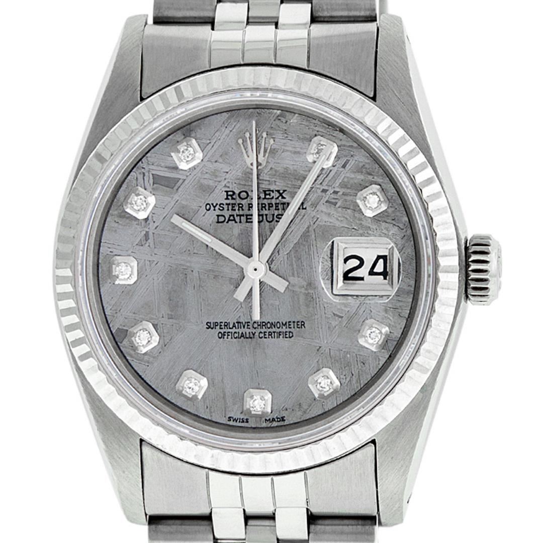 One Gents Rolex Datejust Polished Bright with Satin Finish, Serviced & Electronically Tested, Stainless Steel Case:36mm, Stainless Steel Crown, Bezel: 14K White Gold Fluted Bezel. Custom Crystal: Acrylic Cyclops Lens. Movement: Automatic Winding Movement Caliber 3035. Custom Dial: Meteorite Diamond Dial, Diamond Count: 10 Diamond in Dial G To H In Color, SI-VS Clarity. Date Window: 3 O'Clock Position Date Display, Quickset, Model: Datejust, Condition: G-6 Extra Fine. Bracelet: Stainless Steel Jubilee. Bright Polish & Satin Finish. 7.0 Inch Length, Adjustable. Standard Clasp, With Rolex Logo.