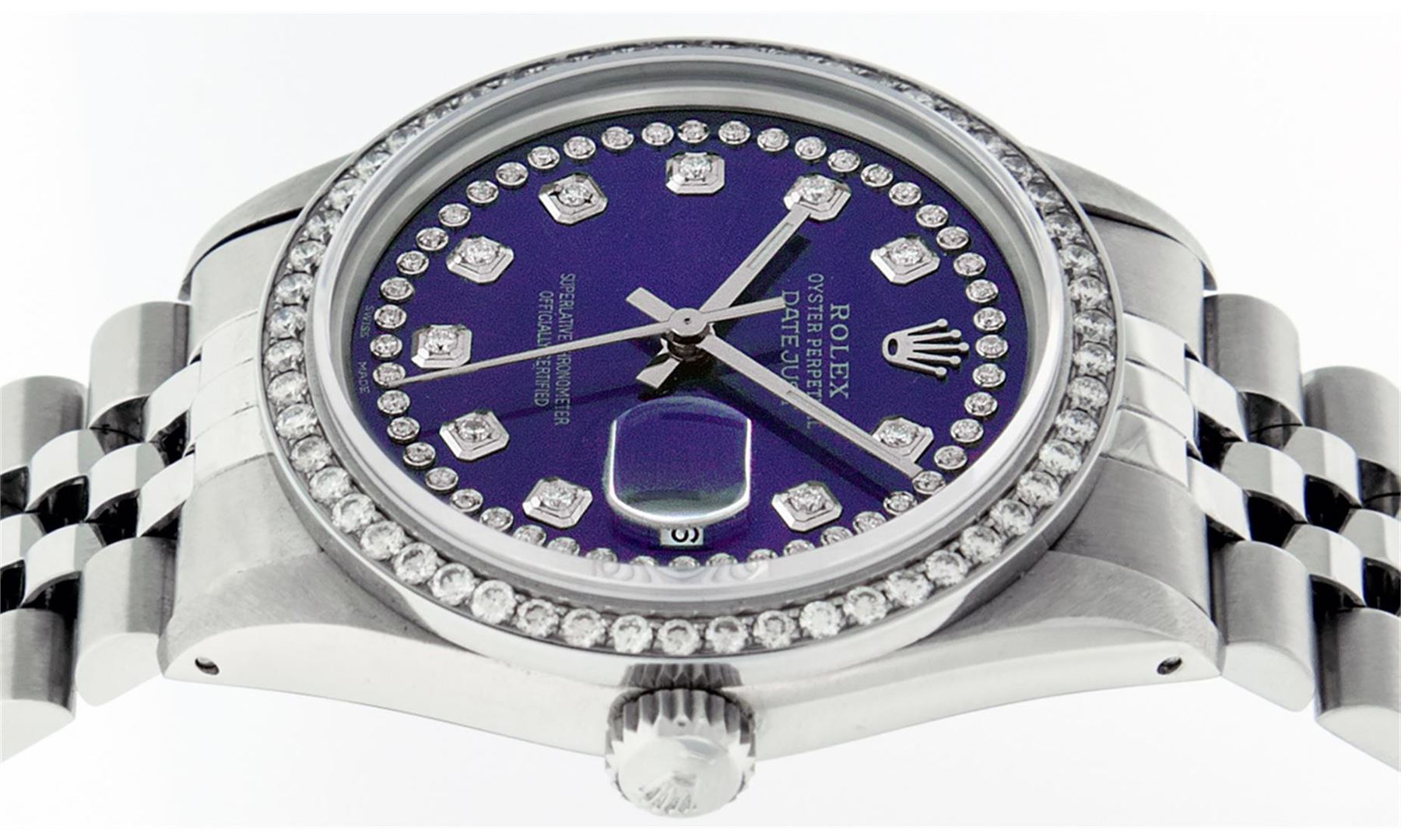 One Mens Rolex Datejust Polished Bright with Satin Finish, Serviced & Electronically Tested, Stainless Steel Case:36mm, Stainless Steel Crown, Custom Bezel: Stainless Steel Beadset Diamond Bezel, Diamond Count: 54 Diamonds Total Weight 1.00 Carat, Clarity: SI-VS, Color: G to H. Custom Crystal: Synthetic Sapphire Cyclops Lens. Movement: Automatic Winding Movement Caliber 3035. Custom Dial: Purple String Diamond Dial, Diamond Count: 58 Diamonds In Dial, Color: G to H, Clarity: VS2-SI1. Date Window: 3 O'Clock Position Date Display, Quickset, Model: Datejust. Condition: G-6 Extra Fine. Bracelet: Stainless Steel Jubilee Band. Bright Polish & Satin Finish. 7.0 Inch Length, Adjustable. Standard Clasp, With Rolex Logo. This watch has been serviced time tested and is in excellent condition it is free of all scratches and dents.