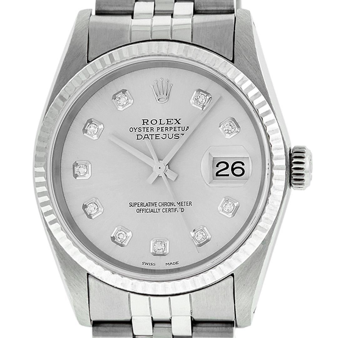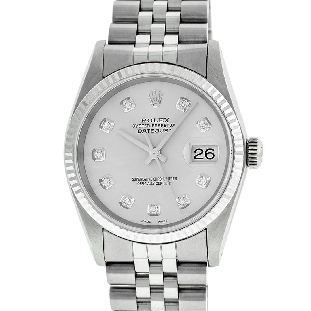 One Gents Rolex Datejust Polished Bright with Satin Finish, Serviced & Electronically Tested, Stainless Steel Case:36mm, Stainless Steel Crown, Bezel: 14K White Gold Fluted Bezel. Custom Crystal: Acrylic Cyclops Lens. Movement: Automatic Winding Movement Caliber 3035. Custom Dial: Silver Diamond Dial, Diamond Count: 10 Diamond in Dial G To H In Color, SI-VS Clarity. Date Window: 3 O'Clock Position Date Display, Quickset, Model: Datejust, Condition: G-6 Extra Fine. Bracelet: Stainless Steel Jubilee. Bright Polish & Satin Finish. 7.0 Inch Length, Adjustable. Standard Clasp, With Rolex Logo. Watch Has Been Serviced And Polished It Is Free Of All Scratches And Dents.