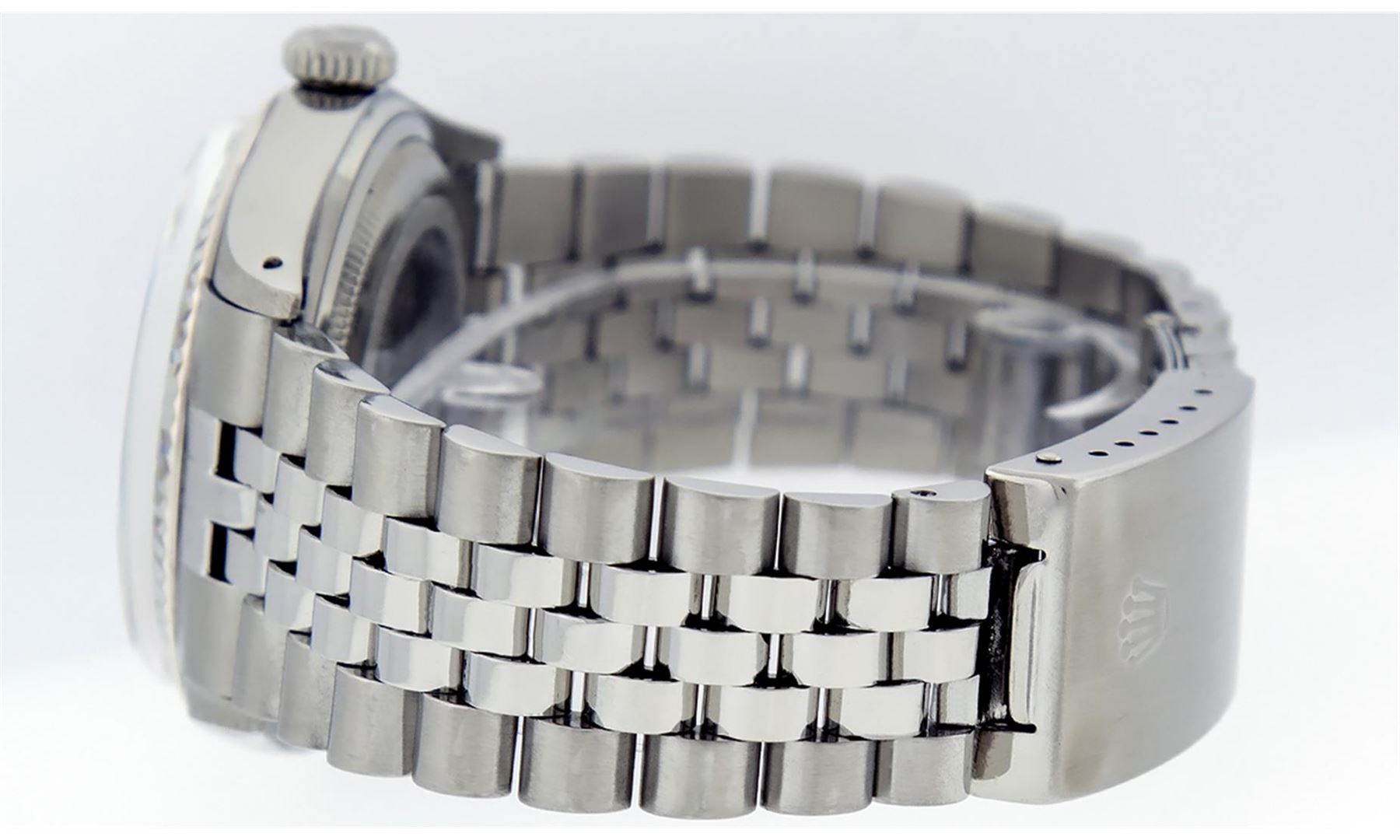 One Gents Rolex Datejust Polished Bright with Satin Finish, Serviced & Electronically Tested, Stainless Steel Case:36mm, Stainless Steel Crown, Bezel: 14K White Gold Fluted Bezel. Custom Crystal: Acrylic Cyclops Lens. Movement: Automatic Winding Movement Caliber 3035. Custom Dial: Silver Diamond Dial With Square Roman Track, Diamond Count: 10 Diamond in Dial G To H In Color, SI-VS Clarity. Date Window: 3 O'Clock Position Date Display, Quickset, Model: Datejust, Condition: G-6 Extra Fine. Bracelet: Stainless Steel Jubilee. Bright Polish & Satin Finish. 7.0 Inch Length, Adjustable. Standard Clasp, With Rolex Logo. Watch Has Been Serviced And Polished It Is Free Of All Scratches And Dents.