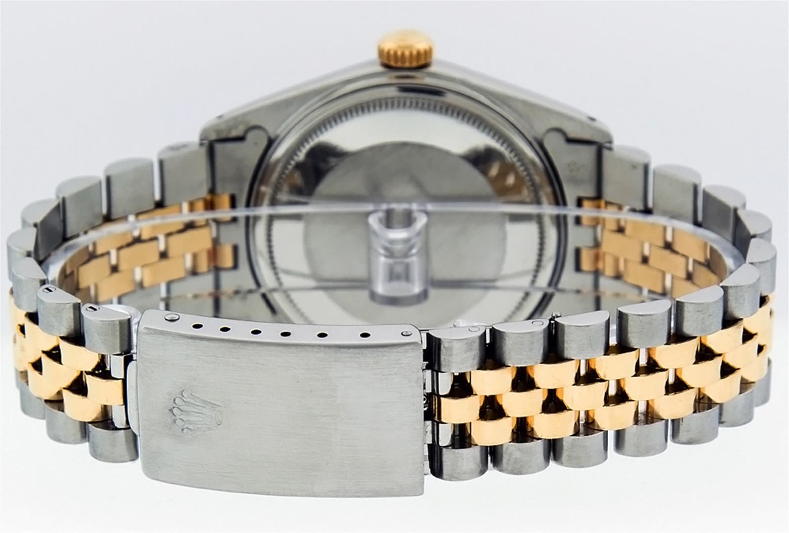 One Gents Two Tone Rolex Datejust Polished, Serviced & Electronically Tested, 14K Yellow Gold & Stainless Steel Case: 36mm, 14K Yellow Gold Crown, Bezel: 18K Yellow Gold Fluted Bezel. Custom Crystal: Acrylic Cyclops Lens. Movement: Automatic Winding Movement Caliber 3035. Custom Dial: Black Dial Set With Diamond Hour Markers And Square Roman Track, Diamond Count: 10 Diamonds in Dial G To H In Color, SI-VS Clarity. Date Window: 3 O'Clock Position Date Display, Quickset, Model: 16013 Condition: G-6 Extra Fine. Bracelet: Two Tone 14K Yellow Gold & Stainless Steel Jubilee. Bright Polish. 7.0 Inch Length, Adjustable. Standard Clasp, With Rolex Logo. Watch Has Been Serviced And Polished It Is Free Of All Scratches And Dents.