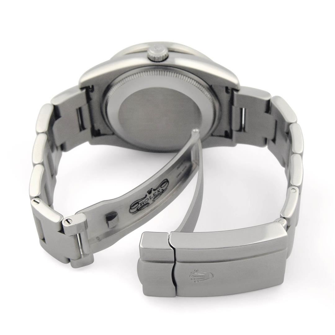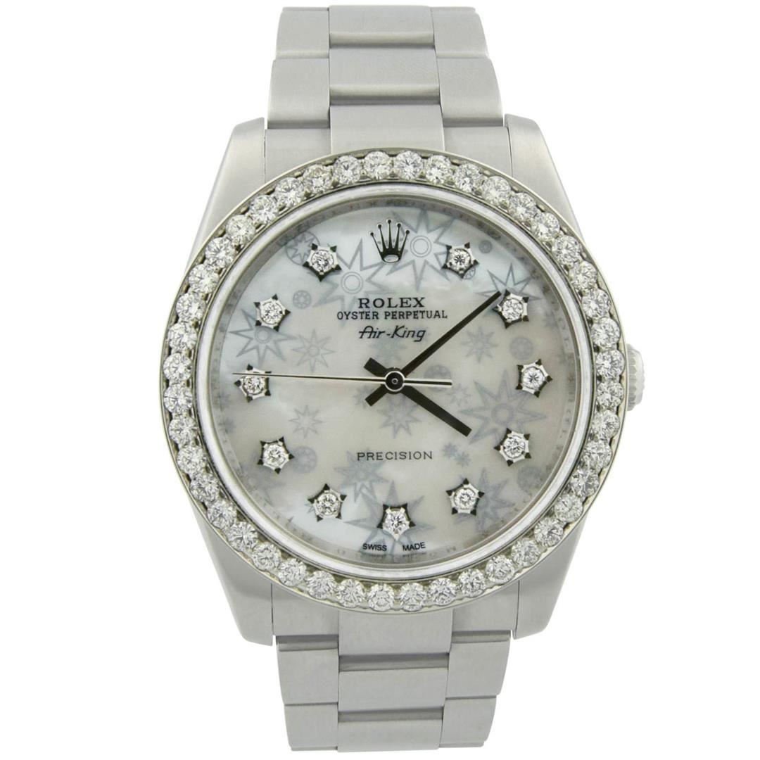 Rolex Air-King Unisex 34mm MOP Diamond Dial Steel Polished & Electronically Tested. Model: Air-King 114200, Steel. Case: Stainless Steel. Bezel: Custom made diamond bezel with round brilliant diamonds all set in prong setting. Total Weight 1.00ctw Clarity: VS-SI Color:G-H. Crystal: Sapphire Crystal. Bracelet: Stainless Steel Oyster Bracelet, Adjustable Standard Clasp with Rolex Logo. Dial: Custom Made Mother of Pearl Diamond Dial with Single Cut Diamond Hour Markers, 11 diamonds in dial Clarity: VS Color: G-H. Movement: Automatic Winding Movement. Water Resistant: Yes. Case Size: 34mm. Condition: Pre Owned, Watch is free of all Scratches and Dents, Mint G-8.