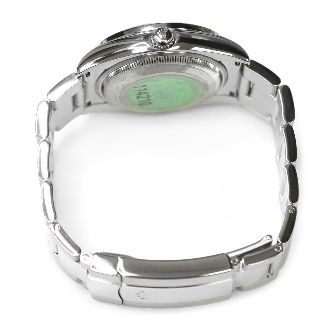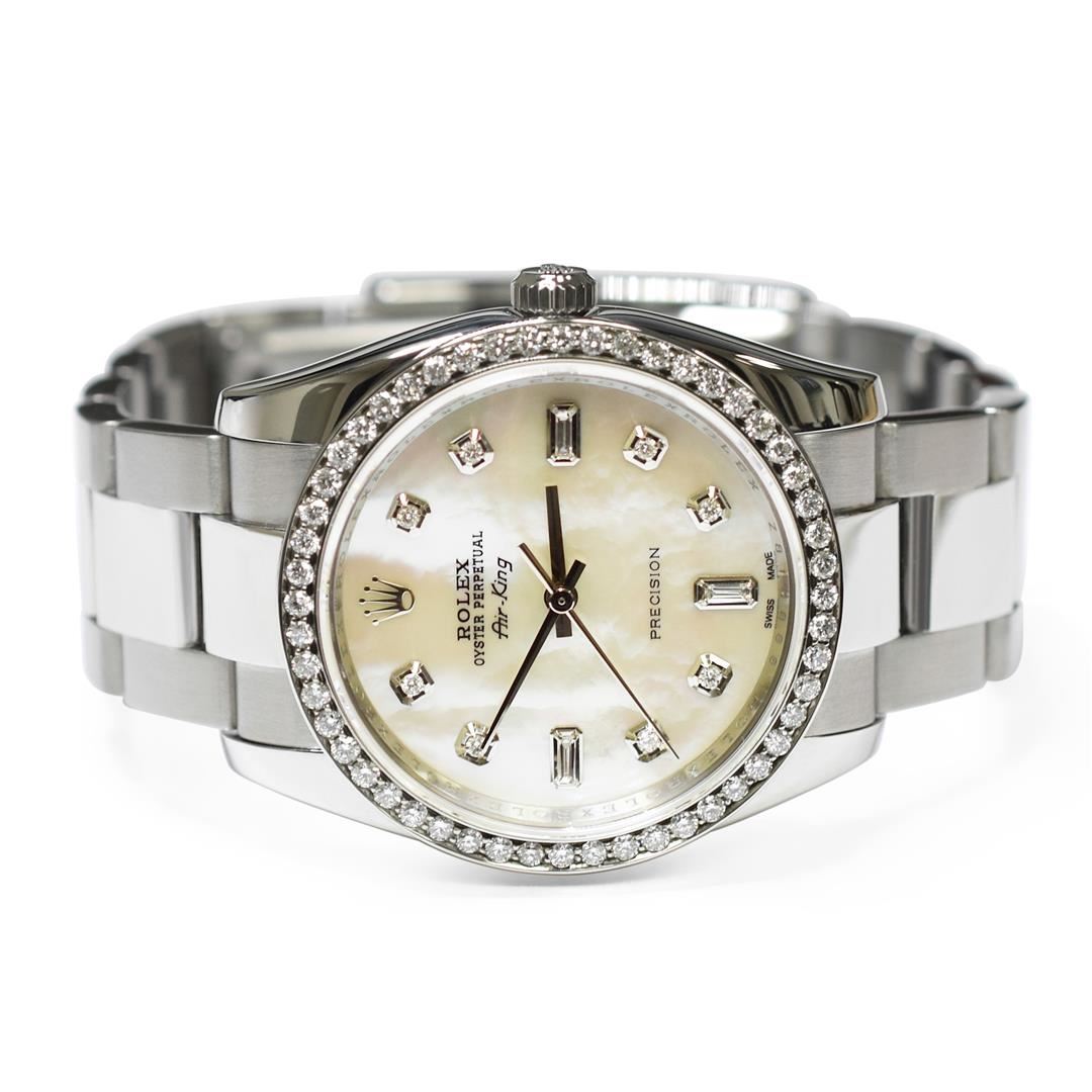 Rolex Air King Mens 34mm MOP Diamond Dial Steel Polished & Electronically Tested. Model: Air King 114210. Case: Stainless Steel. Bezel: Custom made diamond bezel with round brilliant diamonds all set in prong setting. Total Weight 1.05ctw Clarity: VS-SI Color:G-H. Crystal: Sapphire. Bracelet: Stainless Steel, Adjustable Standard Clasp with Rolex Logo. Dial: Mother of Pearl with 0.10ctw Diamond Hour markers. Movement: Automatic Winding Movement. Water Resistant: Yes. Case Size: 34mm. Condition: Pre Owned, Watch is free of all Scratches and Dents, Extra Fine G-6.