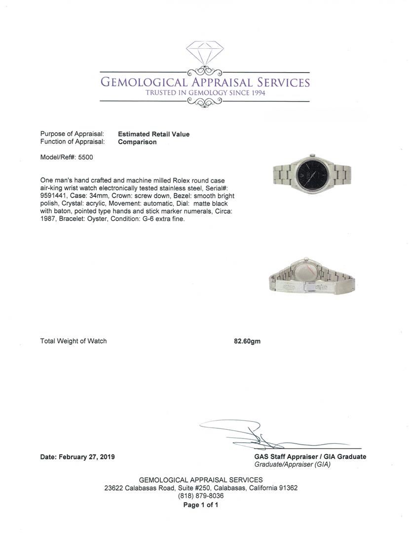 One man's, hand crafted and machine milled Rolex round case air-king wrist watch electronically tested stainless steel, Serial#: 9591441, Case: 34mm, Crown: screw down, Bezel: smooth bright polish, Crystal: acrylic, Movement: automatic, Dial: matte black with baton, pointed type hands and stick marker numerals, Circa: 1987, Bracelet: Oyster, Condition: G-6 extra fine. Total Weight of Watch 82.60gm. GAS Appraised.