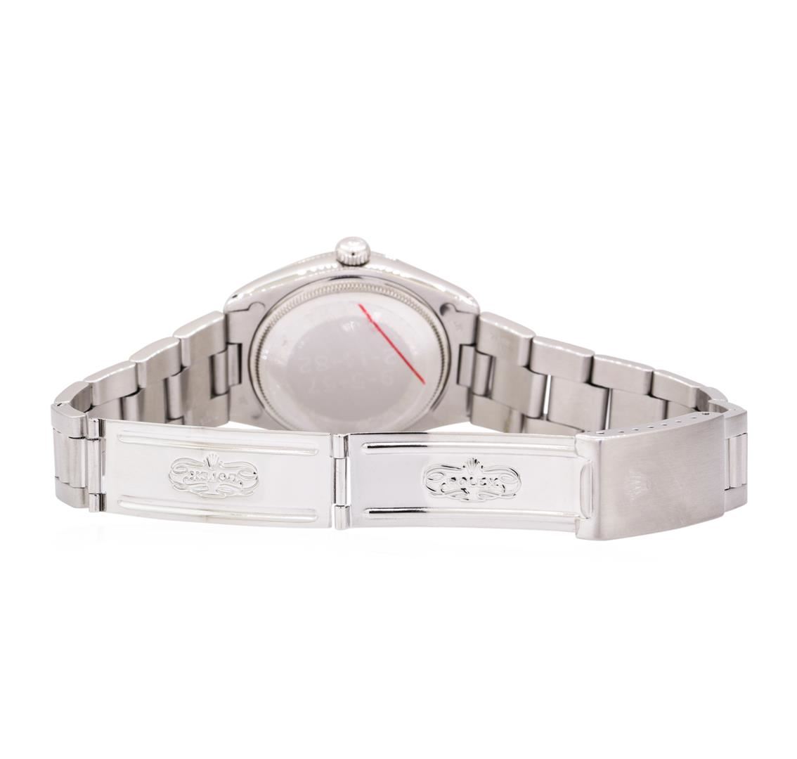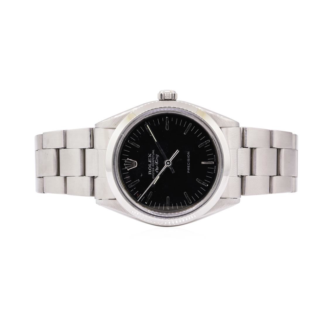 One man's, hand crafted and machine milled Rolex round case air-king wrist watch electronically tested stainless steel, Serial#: 9591441, Case: 34mm, Crown: screw down, Bezel: smooth bright polish, Crystal: acrylic, Movement: automatic, Dial: matte black with baton, pointed type hands and stick marker numerals, Circa: 1987, Bracelet: Oyster, Condition: G-6 extra fine. Total Weight of Watch 82.60gm. GAS Appraised.