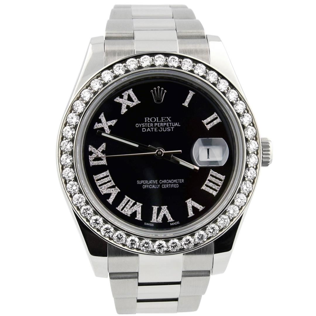 Rolex Datejust II Mens 41mm Black Roman Diamond Dial, Stainless Steel Polished & Electronically Tested. Model: Datejust II 116300. Case: Stainless Steel. Bezel: Custom made diamond bezel with round brilliant diamonds all set in prong setting. Total Weight 3.00ctw Clarity: VS-SI Color:G-H. Crystal: Sapphire. Bracelet: Stainless Steel, Adjustable Standard Clasp with Rolex Logo. Dial: Original Black With Roman 0.10ctw Diamond Numerals. Date Window: 3 O'clock Position date display. Movement: Automatic Winding Movement. Water Resistant: Yes. Case Size: 41mm. Condition: Pre Owned, Watch is free of all Scratches and Dents, Extra Fine G-6.