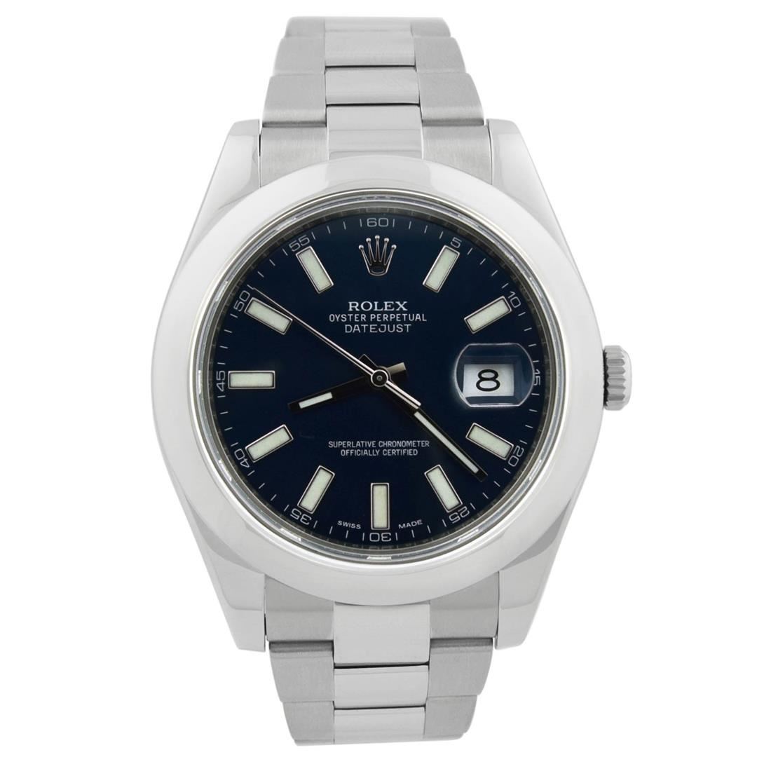 Rolex Mens Datejust II Stainless Steel 41mm Blue Luminous Stick Dial Watch Polished & Electronically Tested. Model: Datejust II. Case: Stainless Steel. Bezel: Stainless Steel. Crystal: Sapphire Crystal. Bracelet: Stainless Steel, Adjustable Standard Clasp with Rolex Logo. Dial: Blue Luminous Stick Dial. Date Window: 3 O'clock Position. Movement: Automatic Winding Movement. Water Resistant: Yes. Case Size: 41mm. Condition: Pre Owned, Scratches on Dial, Near Mint G-7.