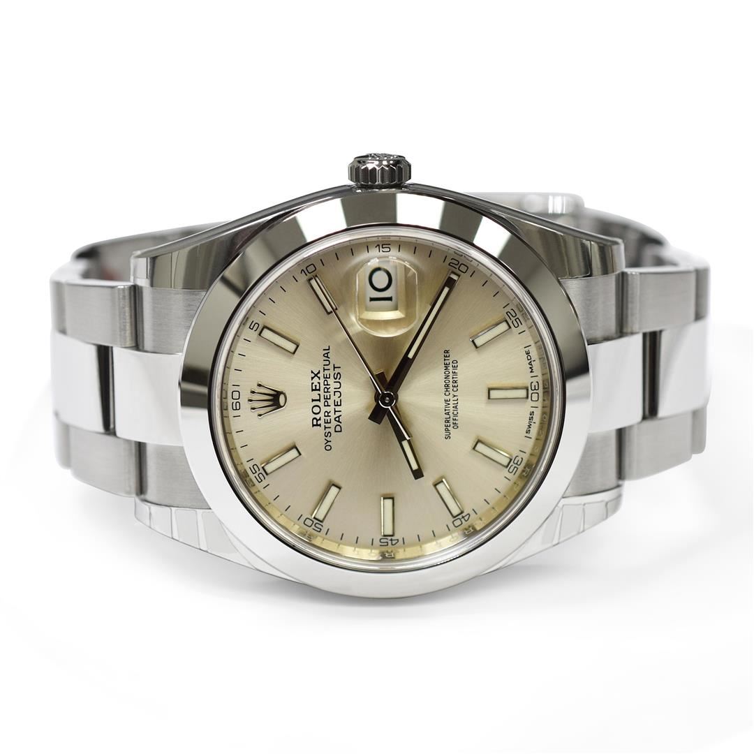 Rolex Mens Datejust Stainless Steel 41mm Silver Stick Luminous Dial Watch Polished & Electronically Tested. Model: Datejust. Case: Stainless Steel. Bezel: Stainless Steel. Crystal: Sapphire Crystal. Bracelet: Stainless Steel, Adjustable Standard Clasp with Rolex Logo. Dial: Silver Stick Luminous Dial. Date Window: 3 O'clock Position. Movement: Automatic Winding Movement. Water Resistant: Yes. Case Size: 41mm. Condition: Pre Owned, Watch is free of all Scratches and Dents, Near Mint G-7.