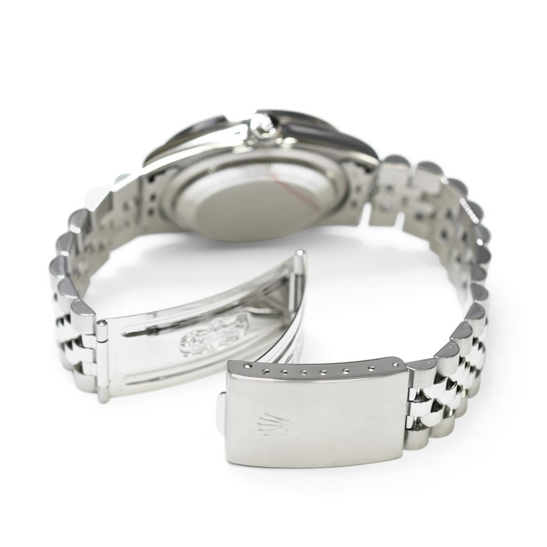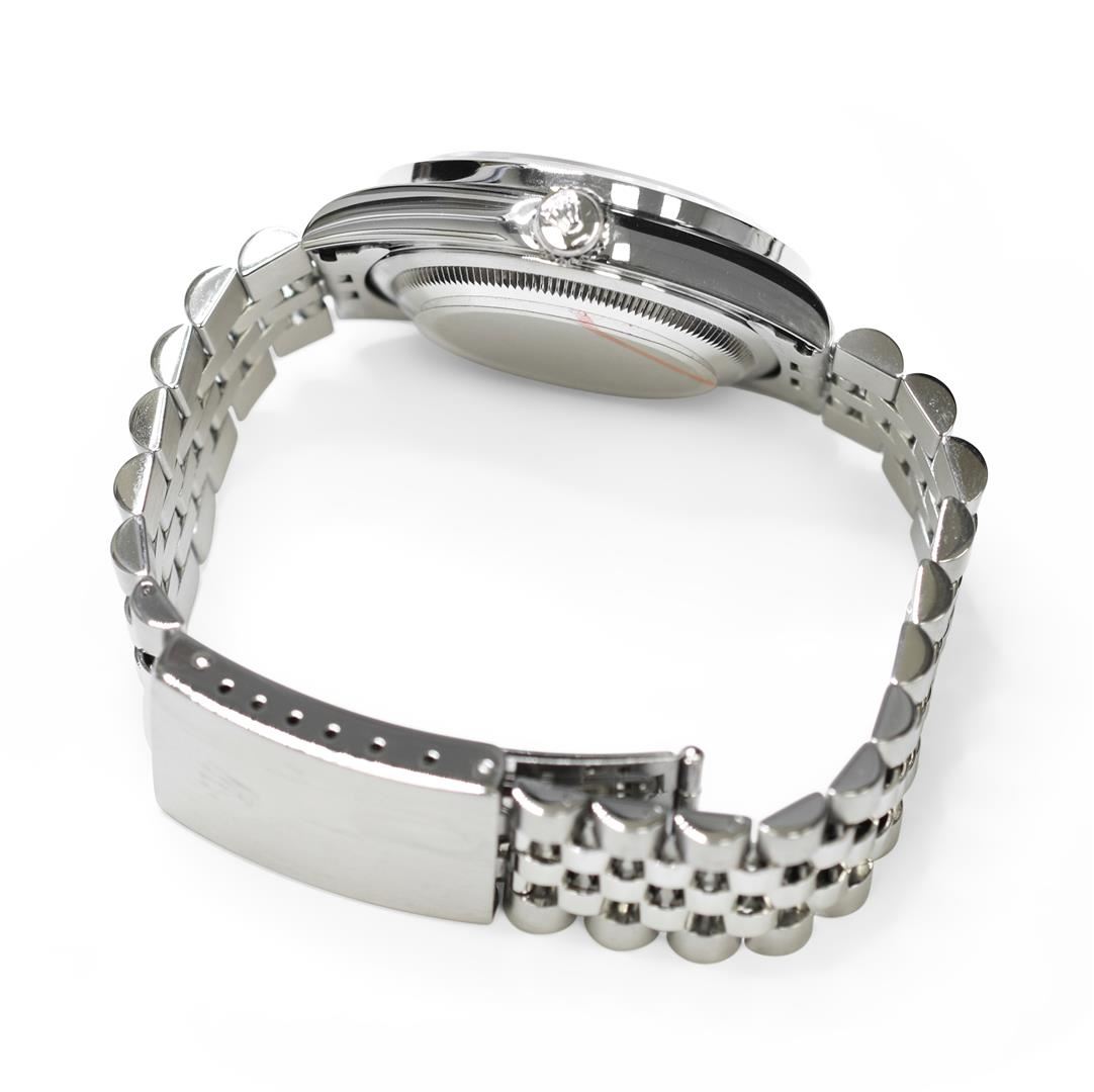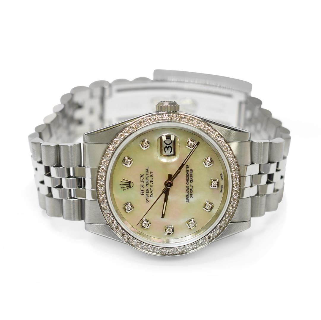 Rolex Datejust Unisex 36mm MOP Diamond Dial Steel Polished & Electronically Tested. Model: Datejust 16220, Steel. Case: Stainless Steel. Bezel: Custom made diamond bezel with round brilliant diamonds all set in prong setting. Total Weight 0.85ctw Clarity: VS-SI Color:G-H. Crystal: Sapphire Crystal. Bracelet: Stainless Steel Jubilee Bracelet, Adjustable Standard Clasp with Rolex Logo. Dial: Custom Made Mother of Pearl Diamond Dial with Single Cut Diamond Hour Markers, 10 diamonds in dial Clarity: VS Color: G-H. Date Window: 3 O'clock Position date display. Movement: Automatic Winding Movement. Water Resistant: Yes. Case Size: 36mm. Condition: Pre Owned, Watch is free of all Scratches and Dents, Extra Fine G-6.