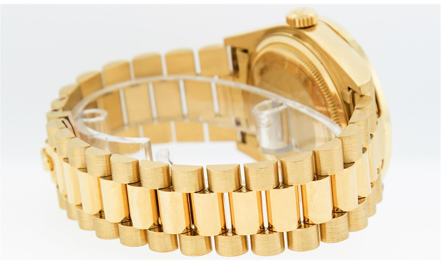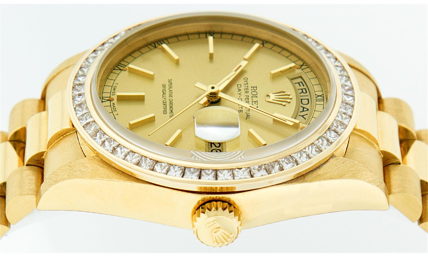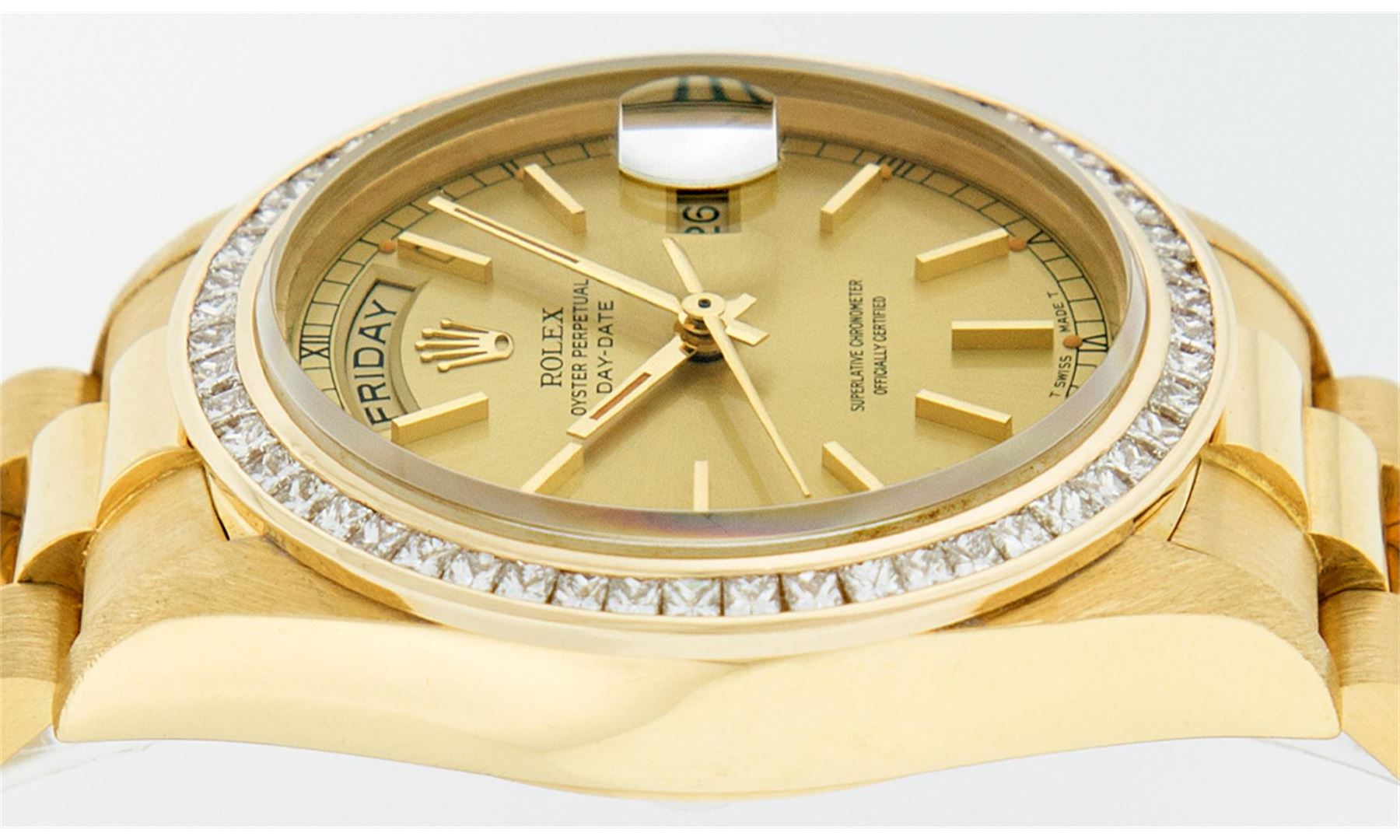 One Mens Rolex Day Date 18K Yellow Gold President Polished, Serviced & Electronically Tested, 18K Yellow Gold Case:36mm, 18K Yellow Gold Crown, Custom Bezel: 14K Yellow Gold Princess Cut Diamond Bezel, Diamond Count: 53 Diamonds In Bezel. Total Weight 2.75 Carat, Clarity: SI-VS, Color: G to H. Custom Crystal: Synthetic Sapphire Cyclops Lens. Movement: Automatic Winding Movement Caliber 3055. Dial: Champagne Index With Square Roman Track. Date Window: 3 O'Clock Position Date Display, Day Window: 12 O'Clock Position Date Display. Quickset, Model: Day Date President. Condition: G-6 Extra Fine The Watch Is In Very Good Condition Free Of All Scratches And Dents. Bracelet: 18K Yellow Gold President. Bright Polish. 7.0 Inch Length, Standard Hidden President Clasp President Band, With Rolex Logo.