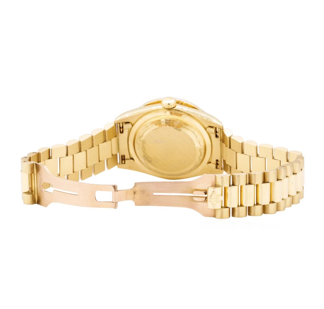 One man's, hand crafted and machine milled Rolex round case President wrist watch electronically tested 18KT yellow gold, Serial#: E746600, Case: 36mm, Crown: screw down twin lock, Bezel: custom diamond set, Crystal: synthetic sapphire with cyclops lens, Movement: superlative chronometer, Dial: custom mother of pearl with baton, narrow type hands and diamond marker numerals, Circa: 1990, Calendar: 12 o'clock and 3 o'clock, Bracelet: President, Condition: G-6 extra fine. Containing: Forty-Four prong set round brilliant cut diamonds, measuring 2.40 - 2.35 x 1.48mm (depth est.) approximate total weight of 44 Stones = 2.25ct. Graded in the setting. Color G - H, Clarity VS-2 to SI-1, Cut Very Good. Total Weight of Diamonds 2.25ct. Total Weight of Watch 138.60gm. GAS Appraised.