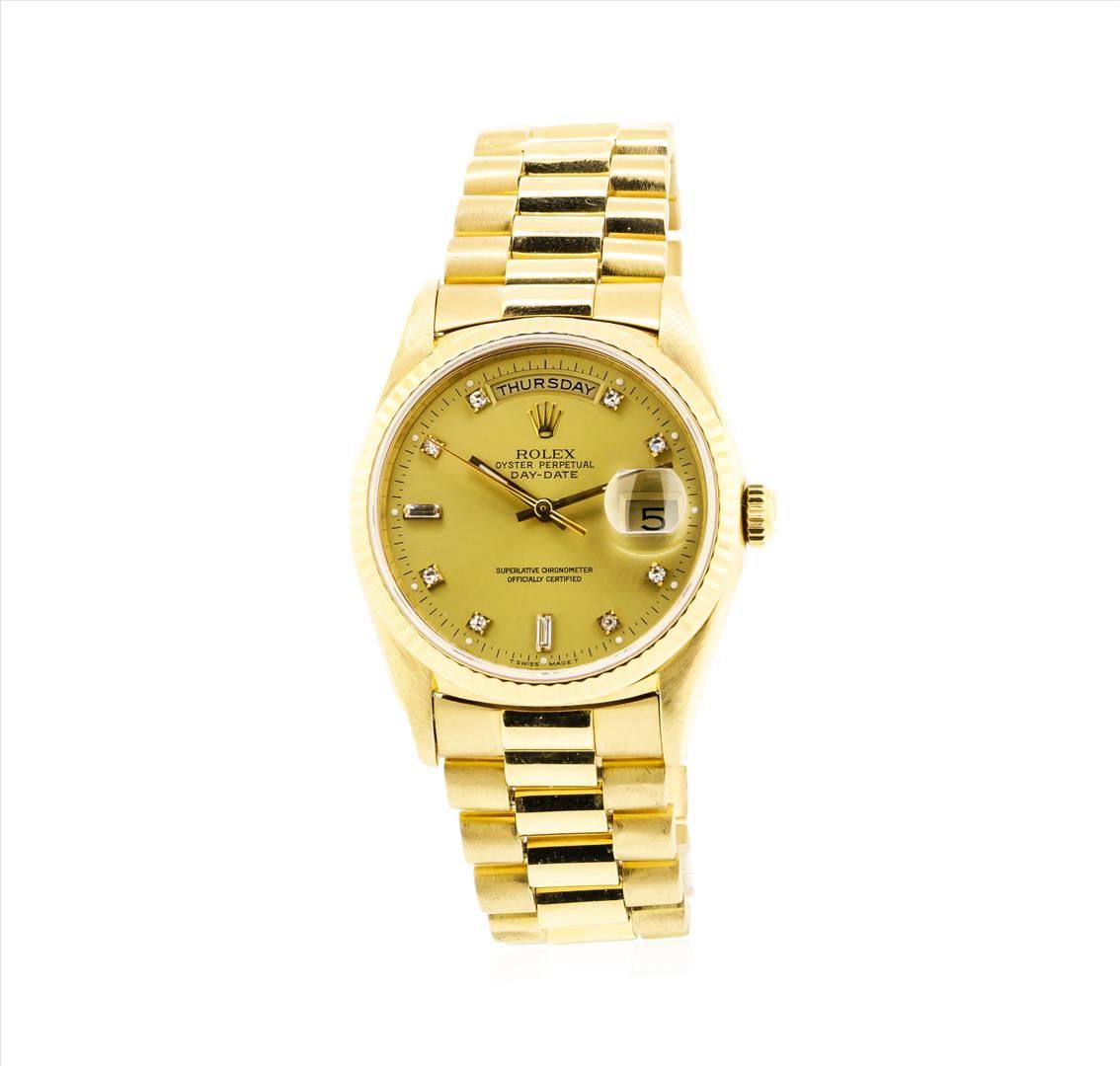 One gents, hand crafted & machine milled Rolex DayDate wristwatch, the President, electronically tested 18KT yellow gold, Swiss Hallmarked Case: 36mm oyster, Rolex Signature Crown: twinlock with logo, Crystal: synthetic sapphire cyclops lens, Bezel: fluted. Circa: 1991.Automatic Movement: superlative chronometer, Rolex signed Dial: Champagne color, with baton hands, & diamond indices, the dial is framed by a bordering minute track, Calendar: double quick set, Rolex Bracelet: 18KT yellow gold, Condition: G-6 Extra Fine. Bright polish & satin finish. Seven and one half inch length. Swiss & Rolex Hallmarked clasp, with logo. Total Weight of Watch 132.97gm. AIG Appraised.