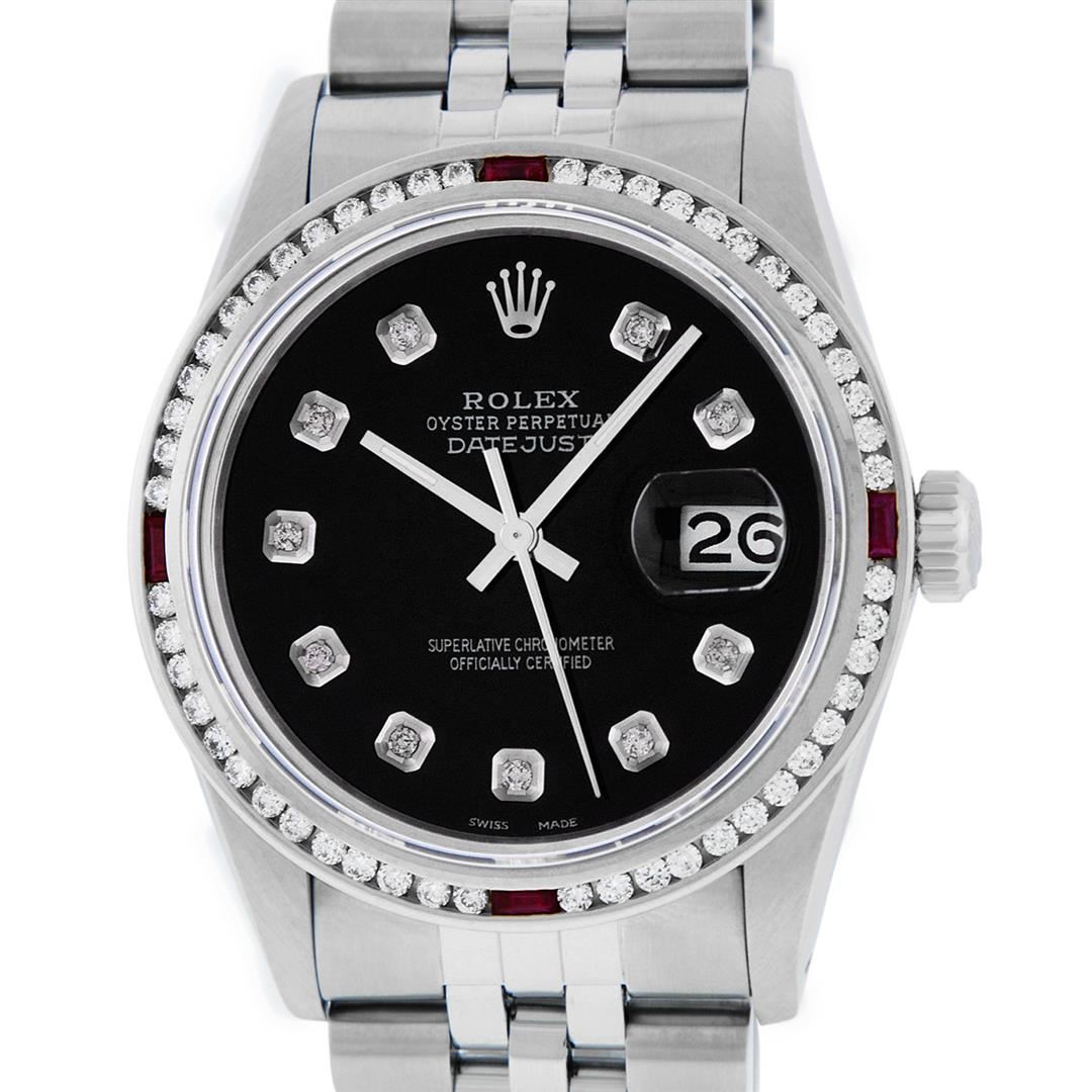 One Men's Stainless Steel Rolex Datejust Polished Bright with Satin Finish, This Watch Has Been Serviced & Electronically Tested, Stainless Steel Case: 36mm, Stainless Steel Crown, Custom Bezel: New 18K White Gold Ruby Channel Set Diamond Bezel, Diamond + Gem Count:�52 Diamonds + 4 Rubies, Total Weight 1.30 Carat, Clarity: SI-VS, Color: G to H. Custom Crystal: New Scratch Resistant Synthetic Sapphire Cyclops Lens. Custom Hands: New Luminescent Hands. Movement: Automatic Winding Movement Caliber 3035. Custom Refinished Dial: Black Diamond Dial, Diamond Count: 10 Diamonds in Dial, Diamond Color: G To H In Color, Clarity: SI-VS. Date Window: 3 O'Clock Position Date Display, Quickset, Model: Datejust, Condition: G-6 Extra Fine. Bracelet: Stainless Steel Jubilee. Bracelet: 7.0 Inch Length, Adjustable. Standard Clasp, With Rolex Logo. This Watch Has Been Serviced Time Tested And Is In Excellent Condition It Is Free Of All Scratches And Dents.