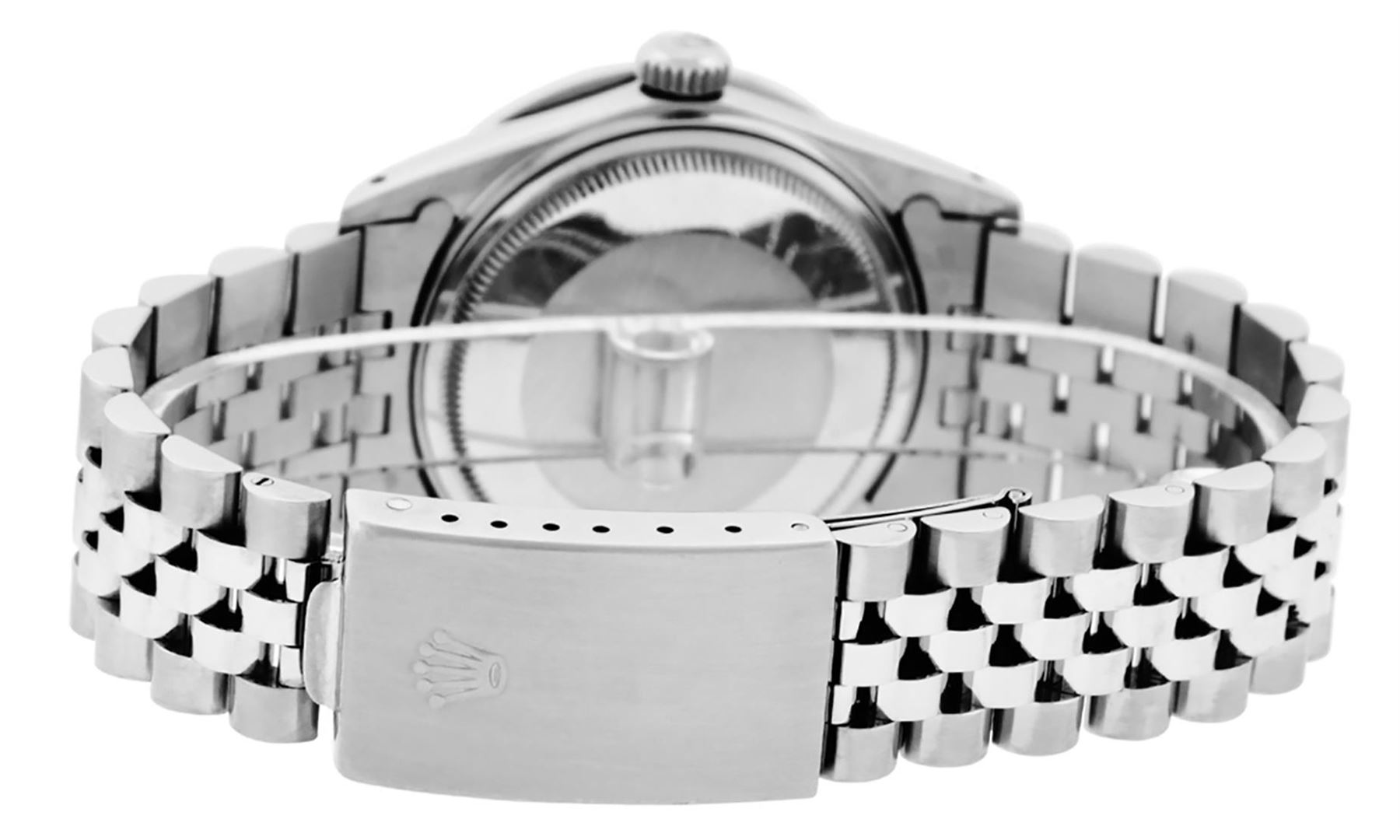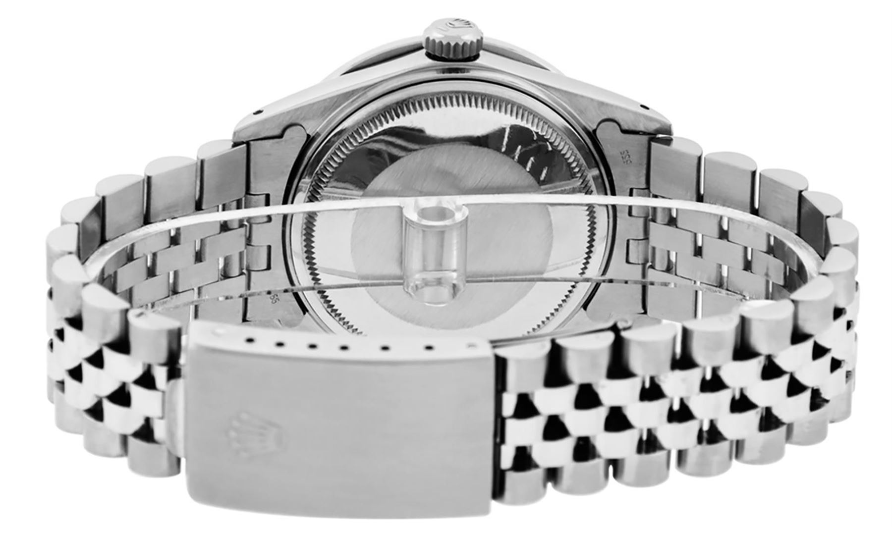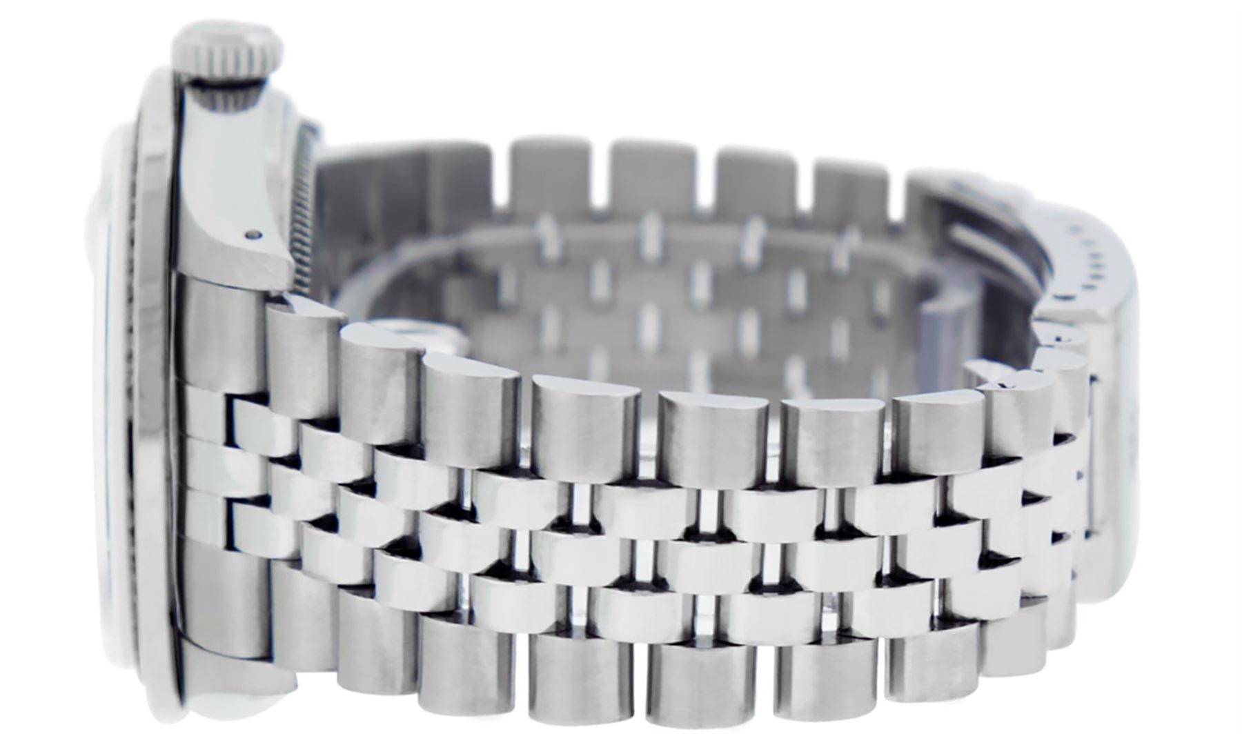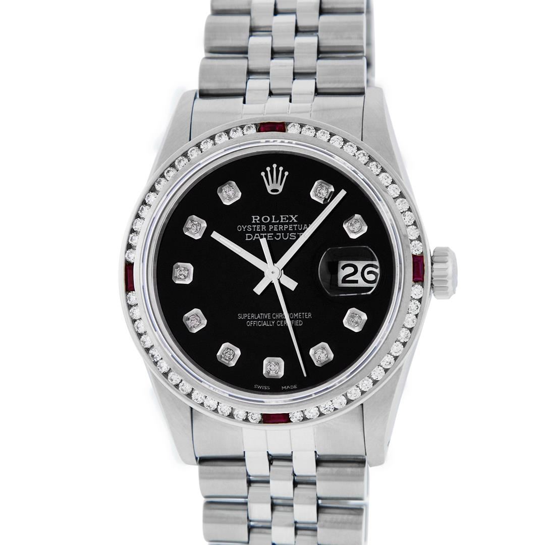 One Men's Stainless Steel Rolex Datejust Polished Bright with Satin Finish, This Watch Has Been Serviced & Electronically Tested, Stainless Steel Case: 36mm, Stainless Steel Crown, Custom Bezel: New 18K White Gold Ruby Channel Set Diamond Bezel, Diamond + Gem Count:�52 Diamonds + 4 Rubies, Total Weight 1.30 Carat, Clarity: SI-VS, Color: G to H. Custom Crystal: New Scratch Resistant Synthetic Sapphire Cyclops Lens. Custom Hands: New Luminescent Hands. Movement: Automatic Winding Movement Caliber 3035. Custom Refinished Dial: Black Diamond Dial, Diamond Count: 10 Diamonds in Dial, Diamond Color: G To H In Color, Clarity: SI-VS. Date Window: 3 O'Clock Position Date Display, Quickset, Model: Datejust, Condition: G-6 Extra Fine. Bracelet: Stainless Steel Jubilee. Bracelet: 7.0 Inch Length, Adjustable. Standard Clasp, With Rolex Logo. This Watch Has Been Serviced Time Tested And Is In Excellent Condition It Is Free Of All Scratches And Dents.