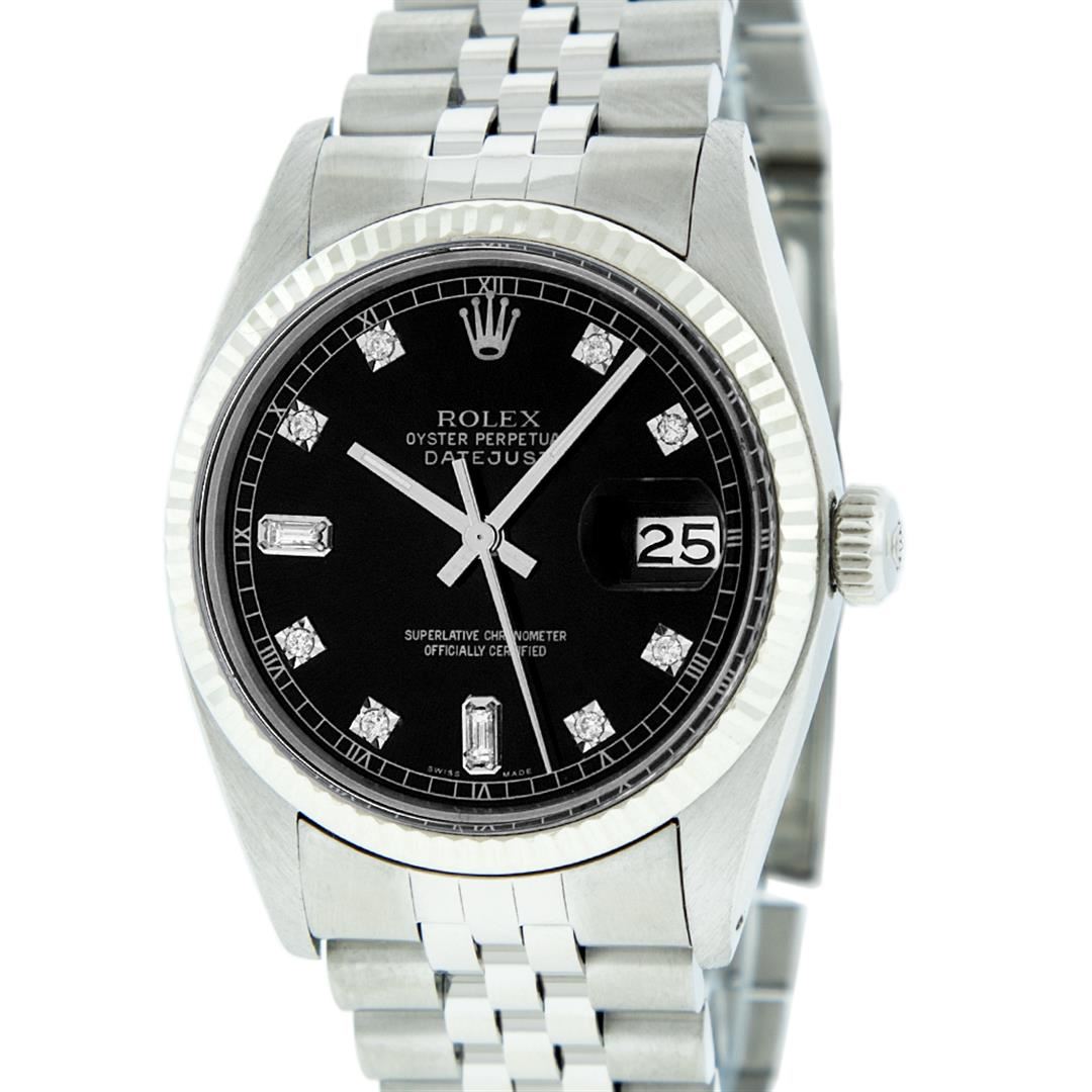 One Mens Stainless Steel Rolex Datejust Polished Bright with Satin Finish, This Watch Has Been Serviced & Electronically Tested, Stainless Steel Case: 36mm, Stainless Steel Crown, Bezel: 14K White Gold Fluted Bezel. Custom Crystal: New Acrylic Cyclops Lens. Custom Hands: New Luminescent Hands. Movement: Automatic Winding Movement Caliber 3035. Custom Dial: Black Diamond 8 + 2 Dial With Roman Track, Diamond Count: 8 Diamonds + 2 Baguettes in Dial G To H In Color, SI-VS Clarity. Date Window: 3 O'Clock Position Date Display, Quickset, Model: Datejust, Condition: G-6 Extra Fine. Bracelet: Stainless Steel Jubilee Band. Bright Polish & Satin Finish. 7.0 Inch Length, Adjustable. Standard Clasp, With Rolex Logo. This Watch Has Been Serviced Time Tested And Is In Excellent Condition It Is Free Of All Scratches And Dents.
