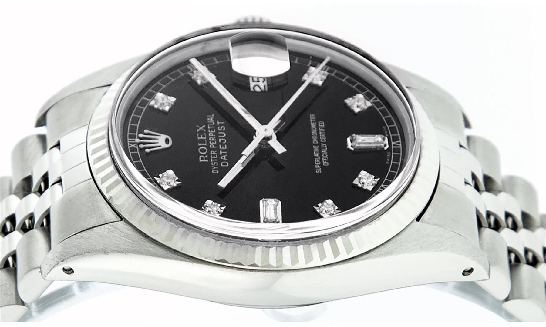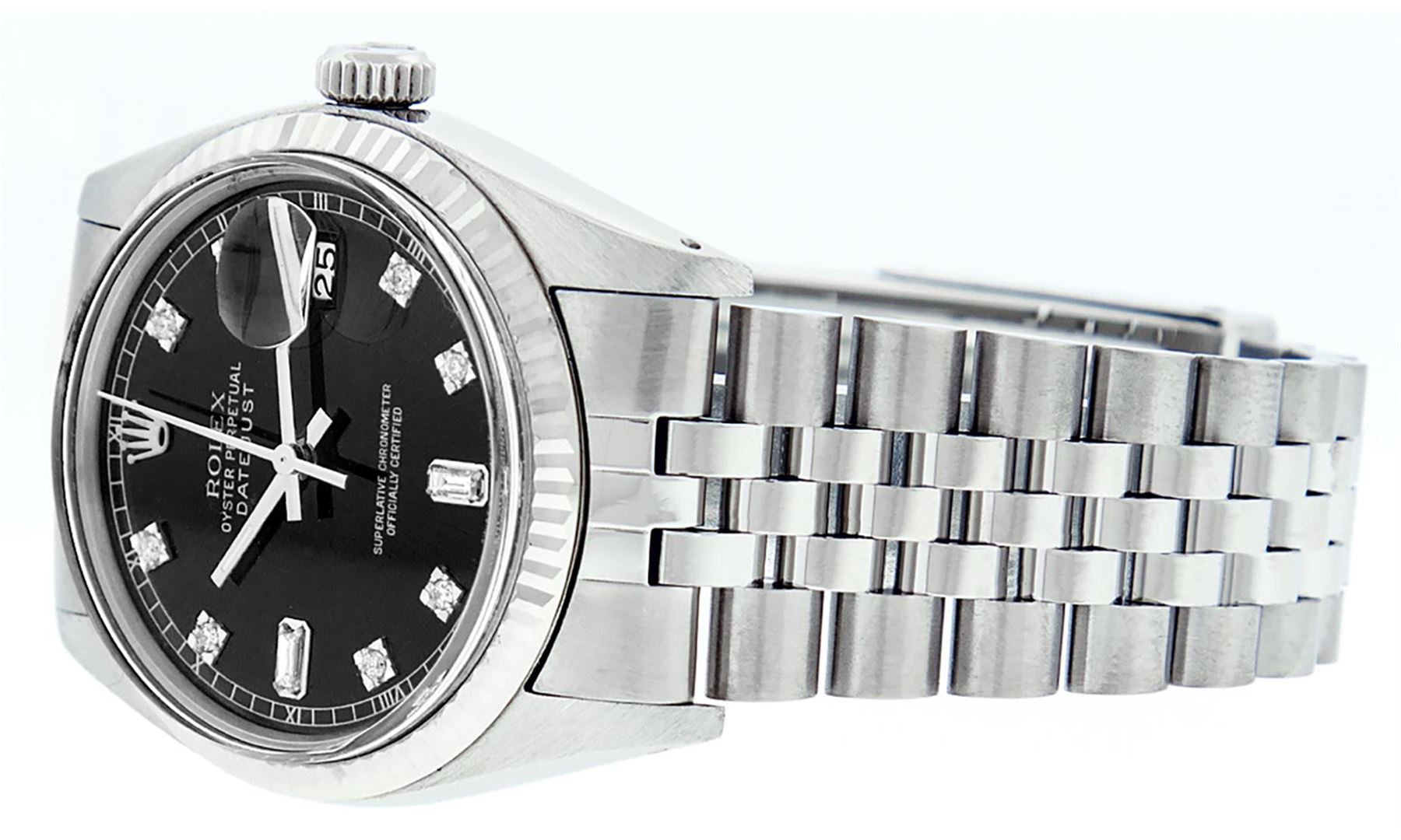 One Mens Stainless Steel Rolex Datejust Polished Bright with Satin Finish, This Watch Has Been Serviced & Electronically Tested, Stainless Steel Case: 36mm, Stainless Steel Crown, Bezel: 14K White Gold Fluted Bezel. Custom Crystal: New Acrylic Cyclops Lens. Custom Hands: New Luminescent Hands. Movement: Automatic Winding Movement Caliber 3035. Custom Dial: Black Diamond 8 + 2 Dial With Roman Track, Diamond Count: 8 Diamonds + 2 Baguettes in Dial G To H In Color, SI-VS Clarity. Date Window: 3 O'Clock Position Date Display, Quickset, Model: Datejust, Condition: G-6 Extra Fine. Bracelet: Stainless Steel Jubilee Band. Bright Polish & Satin Finish. 7.0 Inch Length, Adjustable. Standard Clasp, With Rolex Logo. This Watch Has Been Serviced Time Tested And Is In Excellent Condition It Is Free Of All Scratches And Dents.