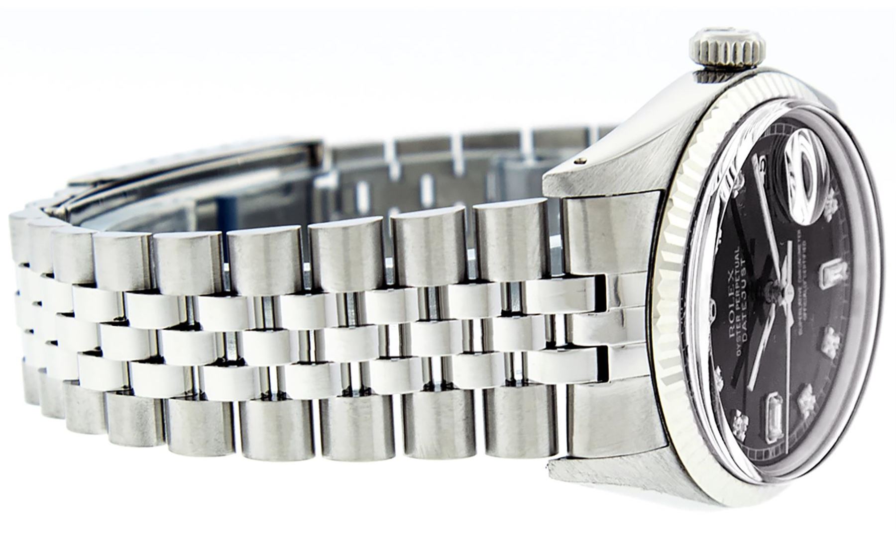 One Mens Stainless Steel Rolex Datejust Polished Bright with Satin Finish, This Watch Has Been Serviced & Electronically Tested, Stainless Steel Case: 36mm, Stainless Steel Crown, Bezel: 14K White Gold Fluted Bezel. Custom Crystal: New Acrylic Cyclops Lens. Custom Hands: New Luminescent Hands. Movement: Automatic Winding Movement Caliber 3035. Custom Dial: Black Diamond 8 + 2 Dial With Roman Track, Diamond Count: 8 Diamonds + 2 Baguettes in Dial G To H In Color, SI-VS Clarity. Date Window: 3 O'Clock Position Date Display, Quickset, Model: Datejust, Condition: G-6 Extra Fine. Bracelet: Stainless Steel Jubilee Band. Bright Polish & Satin Finish.�7.0 Inch Length, Adjustable. Standard Clasp, With Rolex Logo. This Watch Has Been Serviced Time Tested And Is In Excellent Condition It Is Free Of All Scratches And Dents.