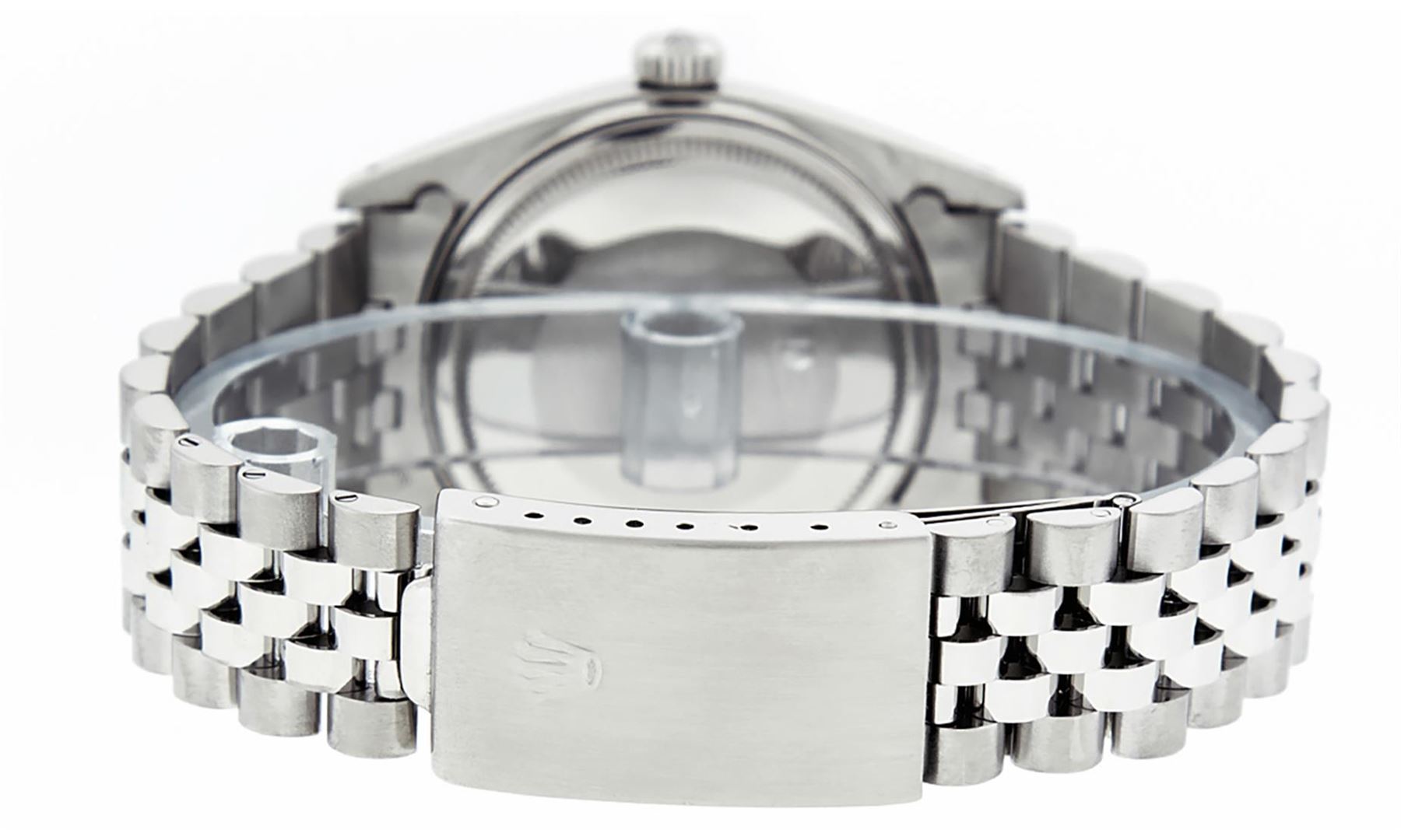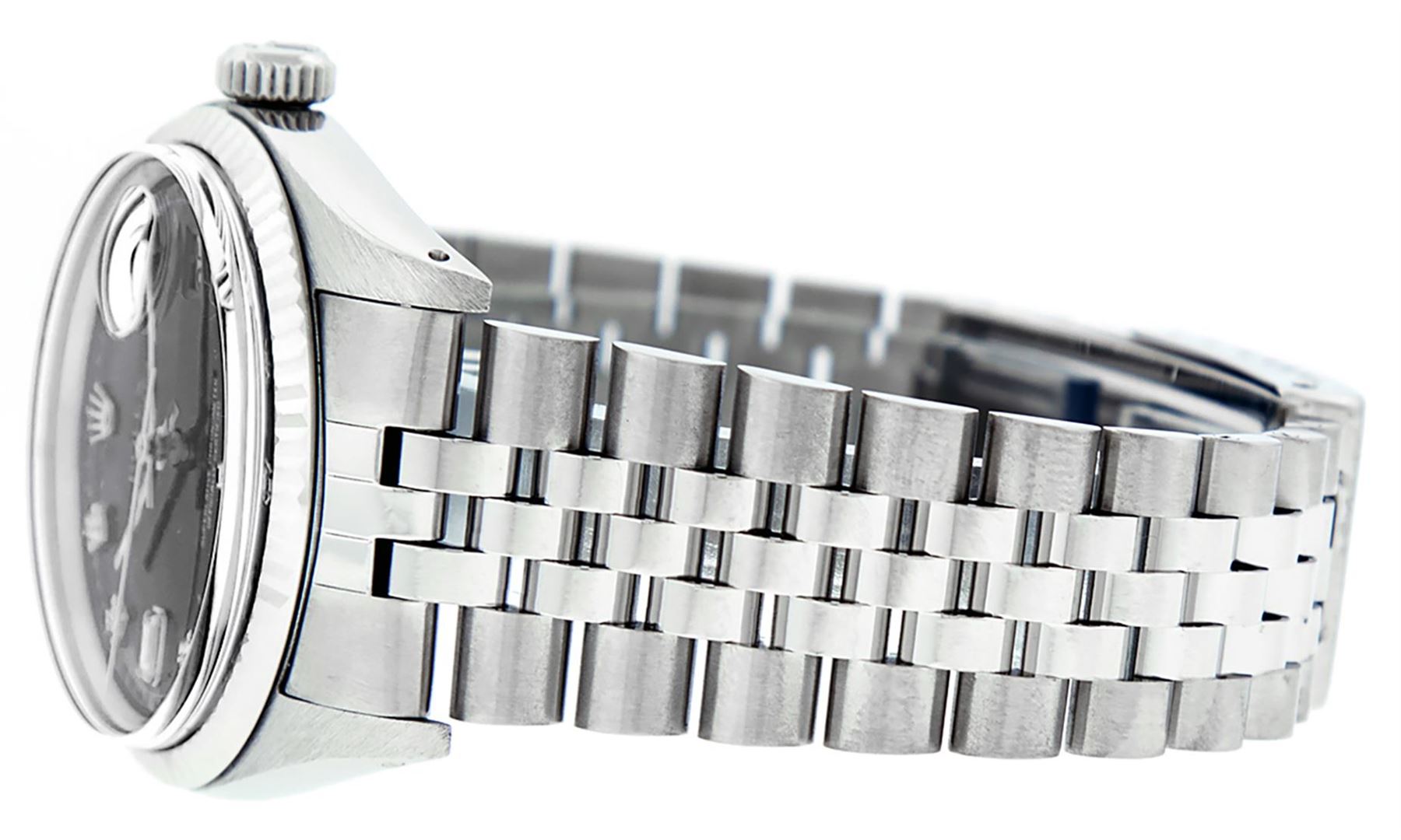 One Mens Pre Owned Stainless Steel Rolex Datejust Polished Bright with Satin Finish, This Watch Has Been Serviced & Electronically Tested, Rolex Stainless Steel Case: 36mm, Rolex Stainless Steel Crown, Rolex Bezel: 14K White Gold Fluted Bezel. Custom Crys
