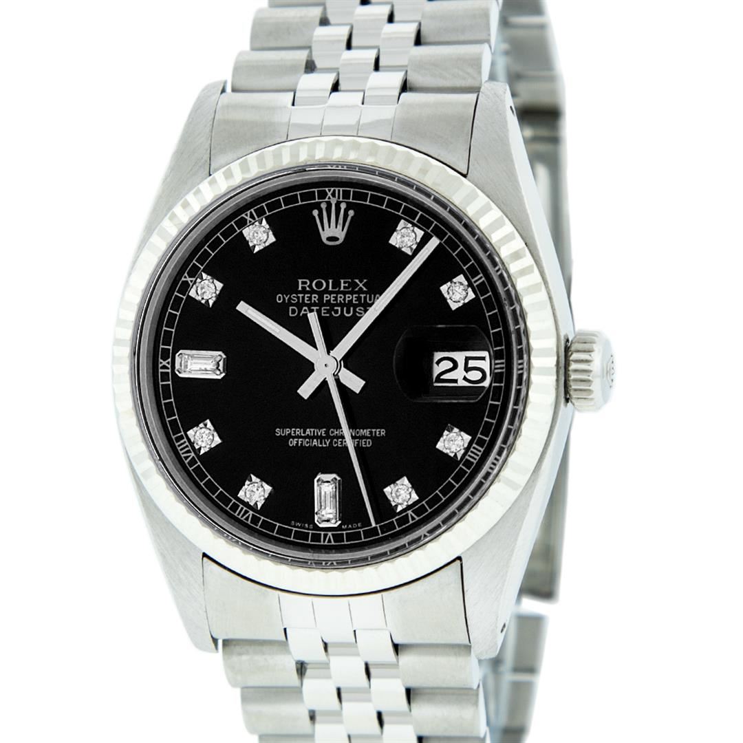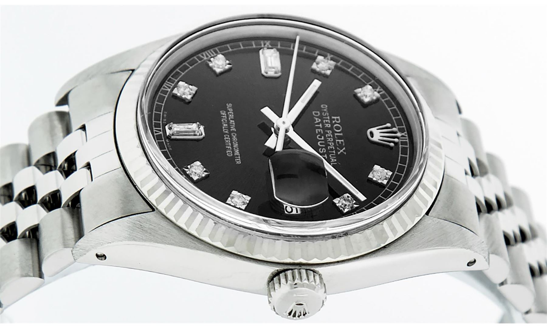 One Mens Pre Owned Stainless Steel Rolex Datejust Polished Bright with Satin Finish, This Watch Has Been Serviced & Electronically Tested, Rolex Stainless Steel Case: 36mm, Rolex Stainless Steel Crown, Rolex Bezel: 14K White Gold Fluted Bezel. Custom Crys