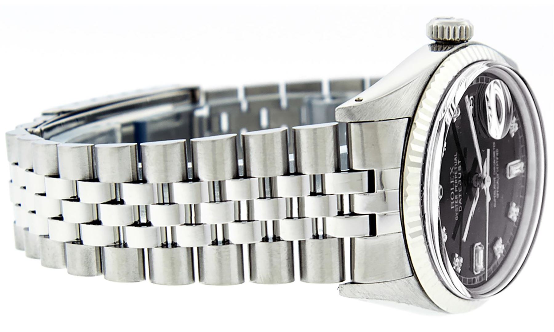 One Mens Pre Owned Stainless Steel Rolex Datejust Polished Bright with Satin Finish, This Watch Has Been Serviced & Electronically Tested, Rolex Stainless Steel Case: 36mm, Rolex Stainless Steel Crown, Rolex Bezel: 14K White Gold Fluted Bezel. Custom Crys