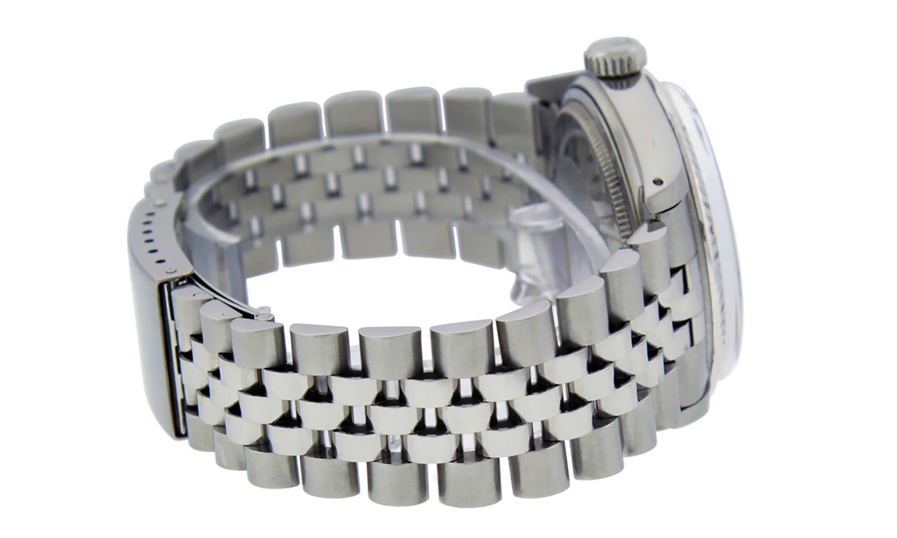 One Mens Pre Owned Stainless Steel Rolex Datejust Polished Bright with Satin Finish, This Watch Has Been Serviced & Electronically Tested, Rolex Stainless Steel Case: 36mm, Rolex Stainless Steel Crown, Rolex Bezel: 14K White Gold Fluted Bezel. Custom Crys
