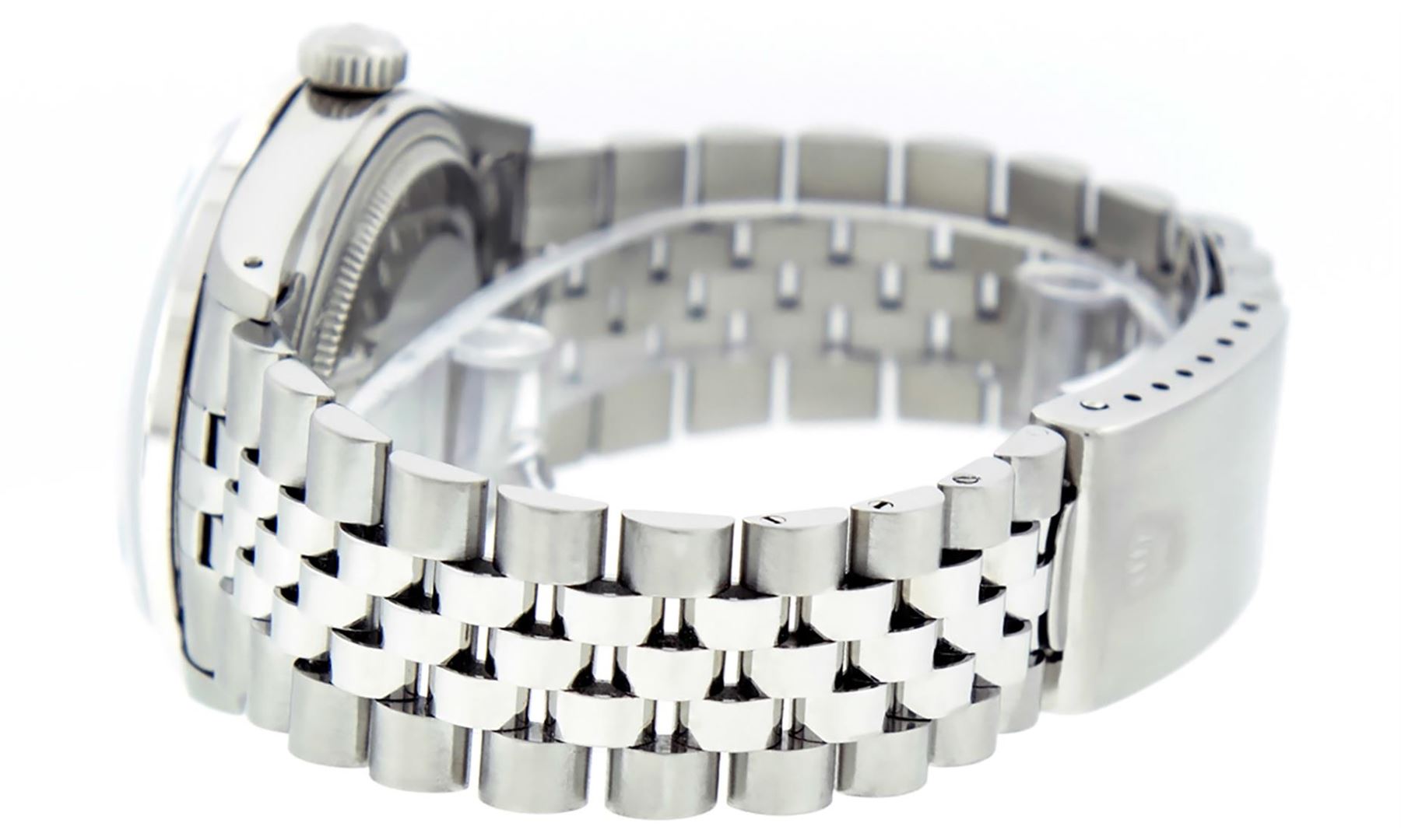 One Mens Pre Owned Stainless Steel Rolex Datejust Polished Bright with Satin Finish, This Watch Has Been Serviced & Electronically Tested, Rolex Stainless Steel Case: 36mm, Rolex Stainless Steel Crown, Rolex Bezel: 14K White Gold Fluted Bezel. Custom Crys