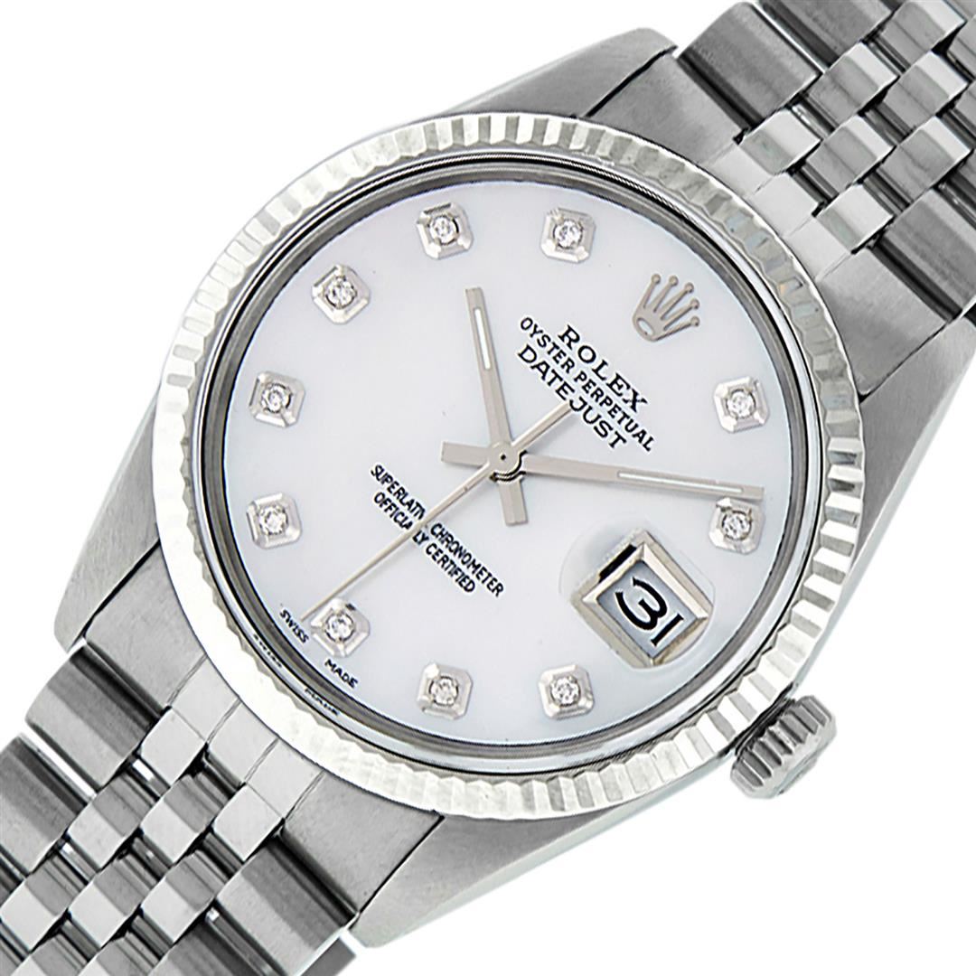 One Mens Pre Owned Stainless Steel Rolex Datejust Polished Bright with Satin Finish, This Watch Has Been Serviced & Electronically Tested, Rolex Stainless Steel Case: 36mm, Rolex Stainless Steel Crown, Rolex Bezel: 14K White Gold Fluted Bezel. Custom Crys