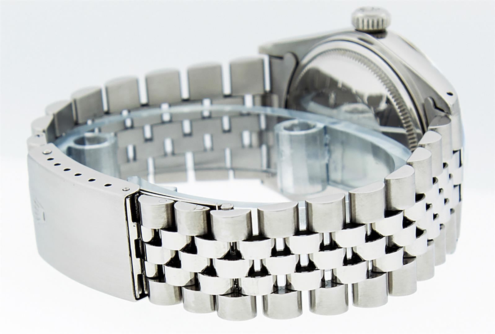 One Mens Pre Owned Stainless Steel Rolex Datejust Polished Bright with Satin Finish, This Watch Has Been Serviced & Electronically Tested, Rolex Stainless Steel Case: 36mm, Rolex Stainless Steel Crown, Rolex Bezel: 14K White Gold Fluted Bezel. Custom Crys