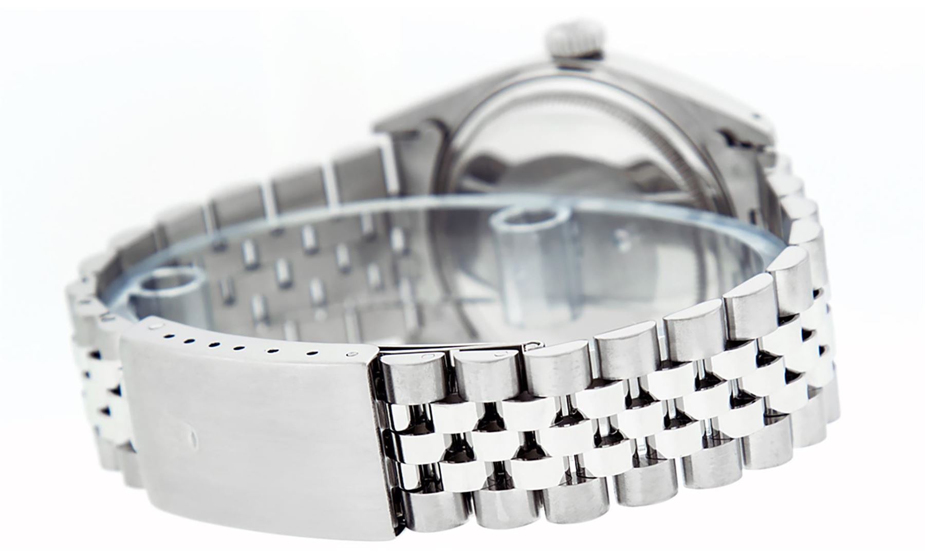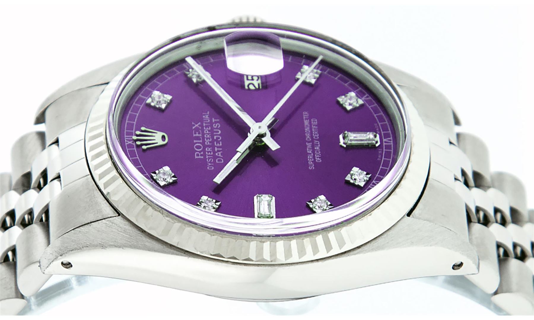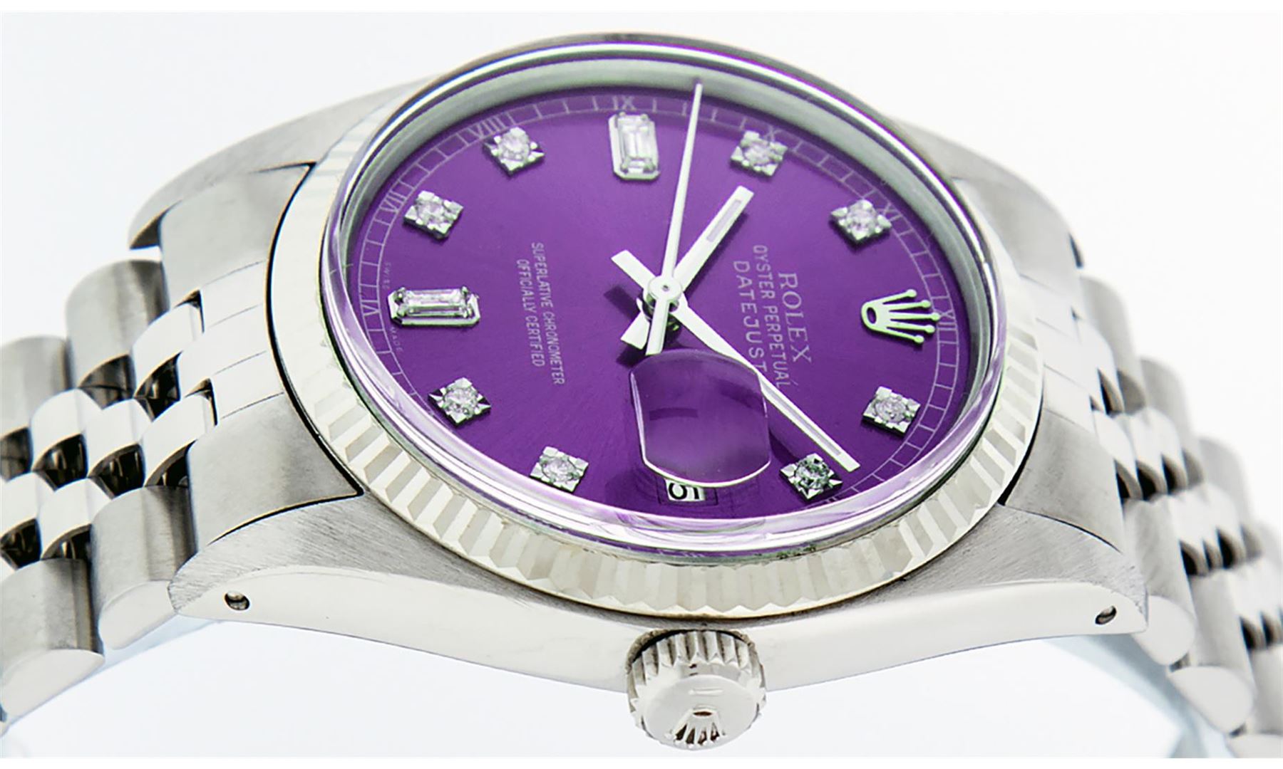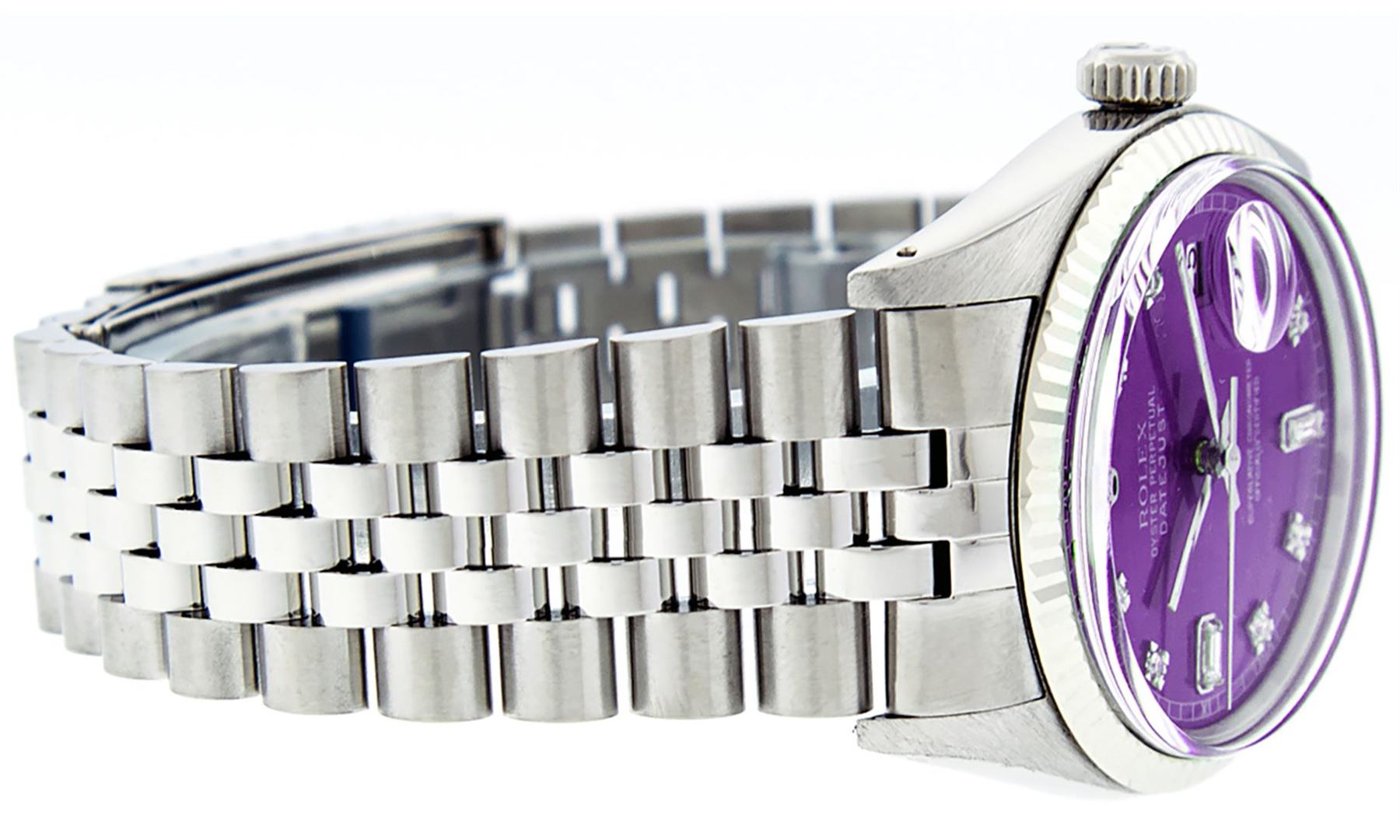 One Mens Stainless Steel Rolex Datejust Polished Bright with Satin Finish, This Watch Has Been Serviced & Electronically Tested, Stainless Steel Case: 36mm, Stainless Steel Crown, Bezel: 14K White Gold Fluted Bezel. Custom Crystal: New Acrylic Cyclops Lens. Custom Hands: New Luminescent Hands. Movement: Automatic Winding Movement Caliber 3035. Custom Dial: Purple Diamond 8 + 2 Dial With Roman Track, Diamond Count: 8 Diamonds + 2 Baguettes in Dial G To H In Color, SI-VS Clarity. Date Window: 3 O'Clock Position Date Display, Quickset, Model: Datejust, Condition: G-6 Extra Fine. Bracelet: Stainless Steel Jubilee Band. Bright Polish & Satin Finish. 7.0 Inch Length, Adjustable. Standard Clasp, With Rolex Logo. This Watch Has Been Serviced Time Tested And Is In Excellent Condition It Is Free Of All Scratches And Dents.