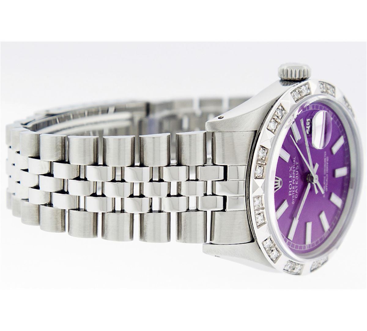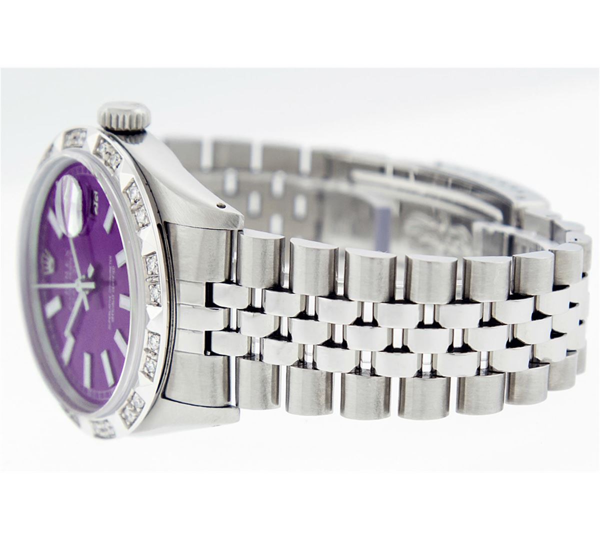 One Mens Rolex Datejust Polished Bright with Satin Finish, Serviced & Electronically Tested, Stainless Steel Case:36mm, Stainless Steel Crown, Custom Bezel: 18K White Gold Pyramid Diamond Bezel, Diamond Count: 24 Diamonds Total Weight .70 Carat, Clarity: SI-VS, Color: G to H. Custom Crystal: Synthetic Sapphire Cyclops Lens. Movement: Automatic Winding Movement Caliber 3035. Custom Dial: Purple Index Dial. Date Window: 3 O'Clock Position Date Display, Quickset, Model: Datejust, Condition: G-6 Extra Fine. Bracelet:Stainless Steel Jubilee. Bright Polish & Satin Finish. 7.0 Inch Length, Adjustable. Standard Clasp, With Rolex Logo.
