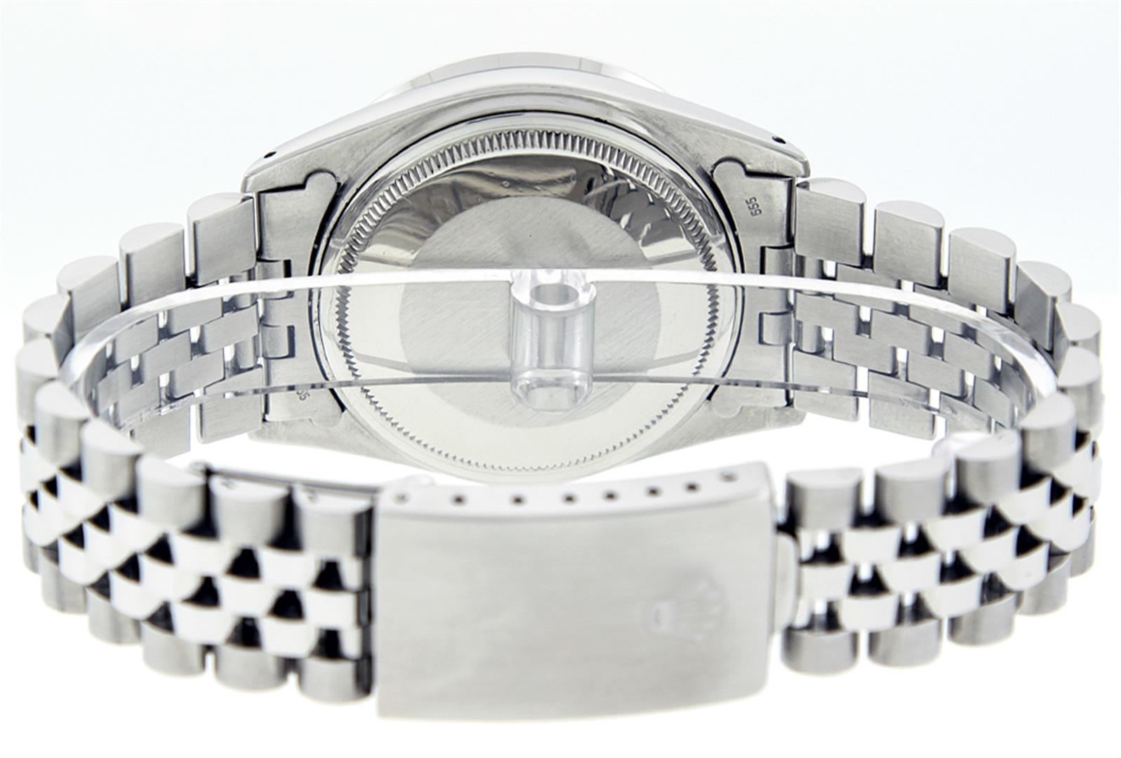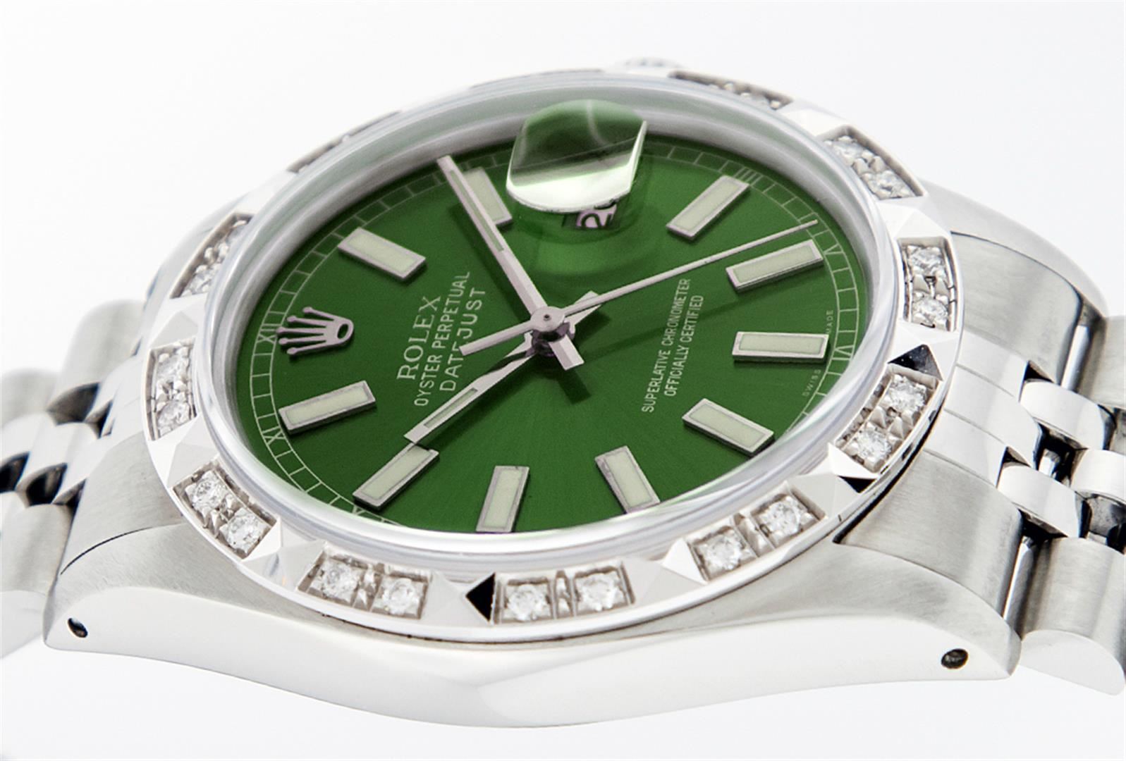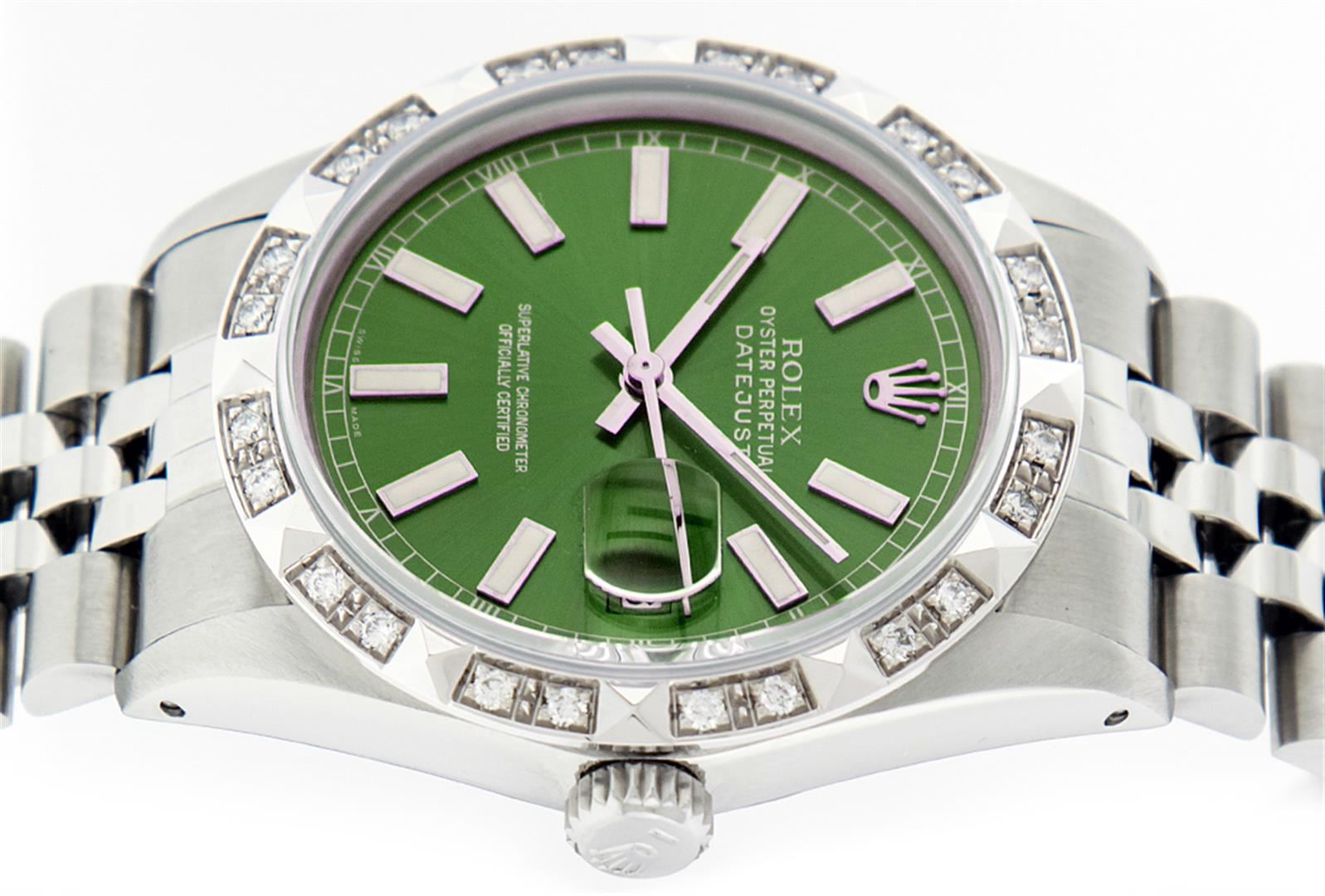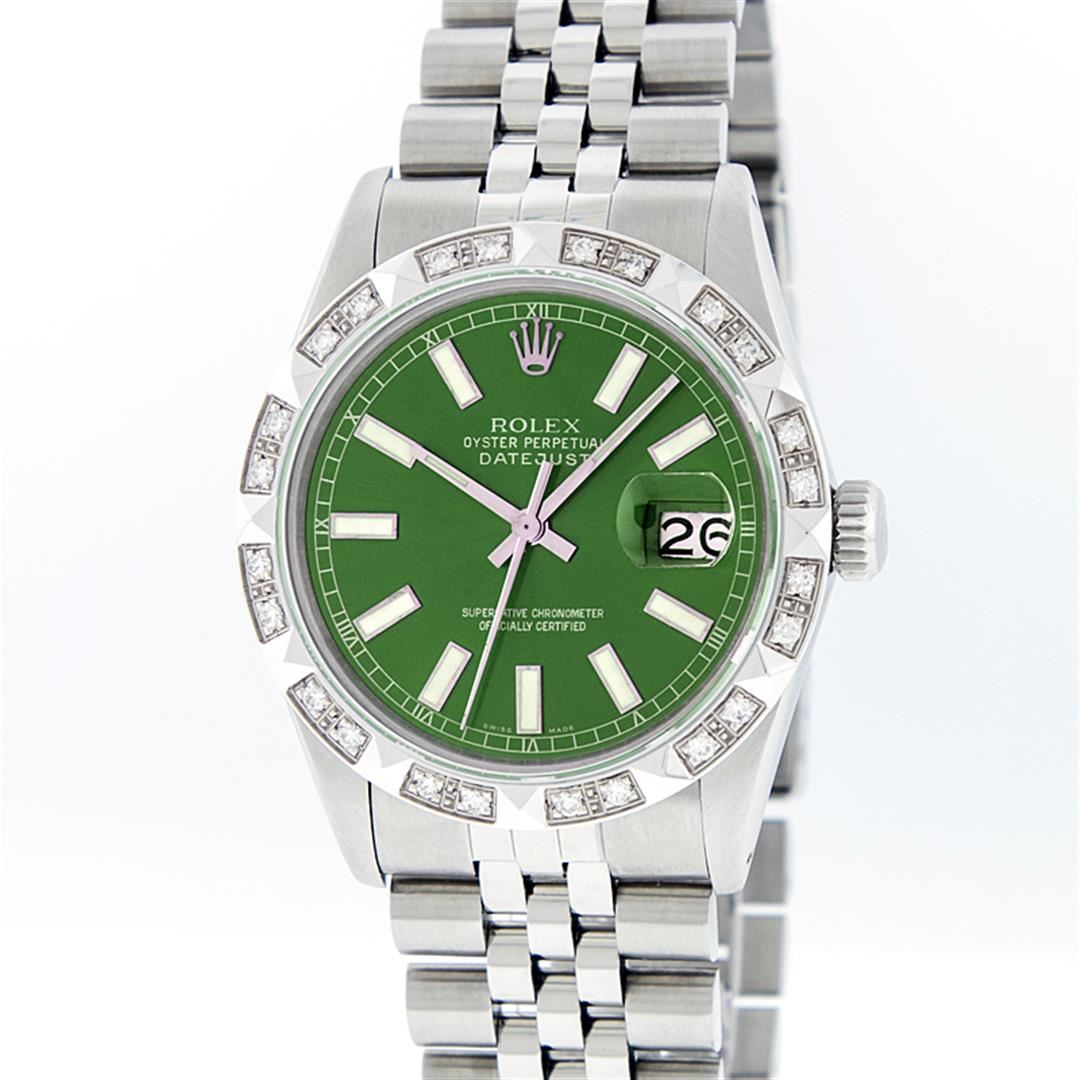 One Mens Rolex Datejust Polished Bright with Satin Finish, Serviced & Electronically Tested, Stainless Steel Case:36mm, Stainless Steel Crown, Custom Bezel: 18K White Gold Pyramid Diamond Bezel, Diamond Count: 24 Diamonds Total Weight .70 Carat, Clarity: SI-VS, Color: G to H. Custom Crystal: Synthetic Sapphire Cyclops Lens. Movement: Automatic Winding Movement Caliber 3035. Custom Dial: Green Index Dial. Date Window: 3 O'Clock Position Date Display, Quickset, Model: Datejust, Condition: G-6 Extra Fine. Bracelet:Stainless Steel Jubilee. Bright Polish & Satin Finish. 7.0 Inch Length, Adjustable. Standard Clasp, With Rolex Logo.