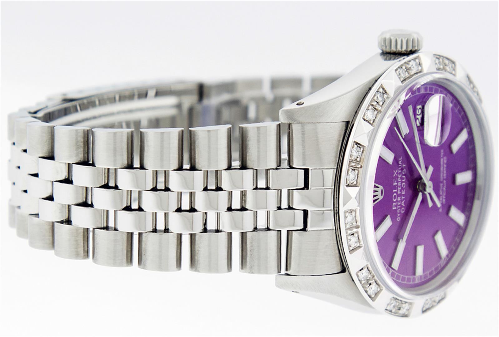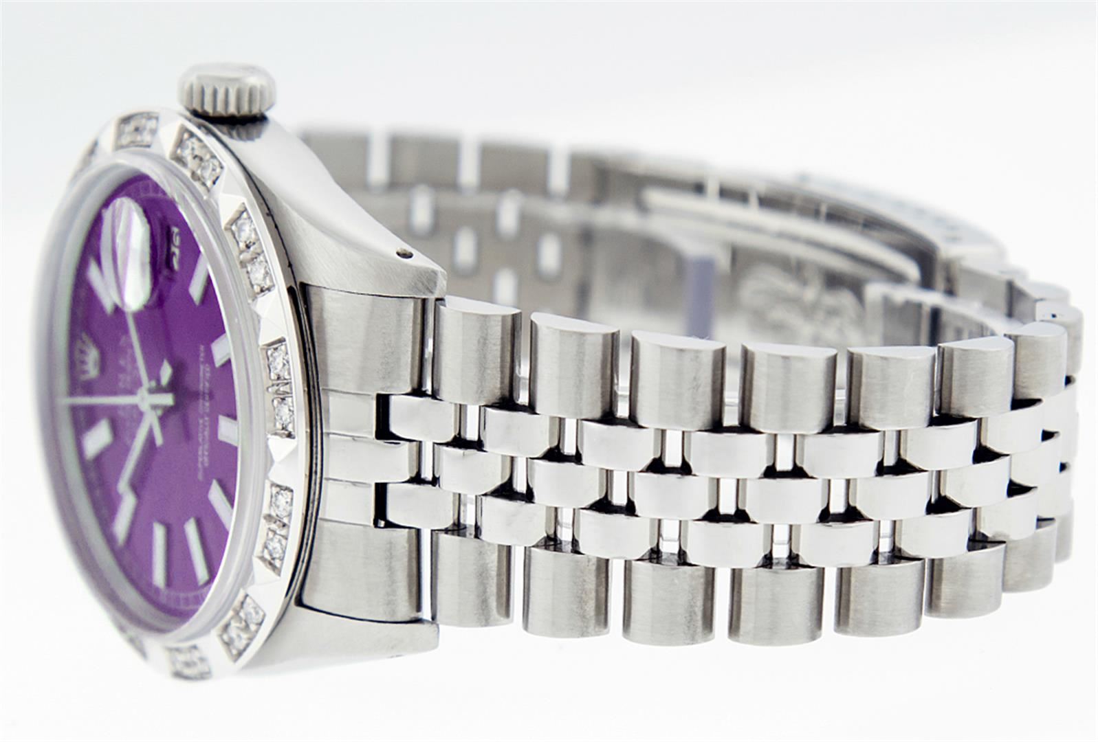 One Mens Rolex Datejust Polished Bright with Satin Finish, Serviced & Electronically Tested, Stainless Steel Case:36mm, Stainless Steel Crown, Custom Bezel: 18K White Gold Pyramid Diamond Bezel, Diamond Count: 24 Diamonds Total Weight .70 Carat, Clarity: SI-VS, Color: G to H. Custom Crystal: Synthetic Sapphire Cyclops Lens. Movement: Automatic Winding Movement Caliber 3035. Custom Dial: Purple Index Dial. Date Window: 3 O'Clock Position Date Display, Quickset, Model: Datejust, Condition: G-6 Extra Fine. Bracelet:Stainless Steel Jubilee. Bright Polish & Satin Finish. 7.0 Inch Length, Adjustable. Standard Clasp, With Rolex Logo.