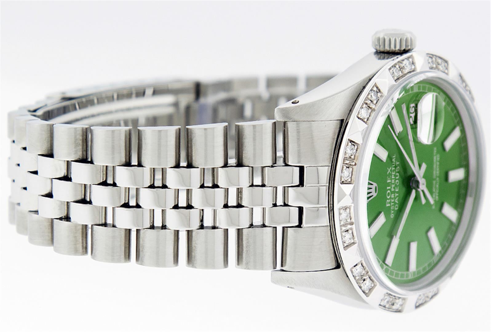 One Mens Rolex Datejust Polished Bright with Satin Finish, Serviced & Electronically Tested, Stainless Steel Case:36mm, Stainless Steel Crown, Custom Bezel: 18K White Gold Pyramid Diamond Bezel, Diamond Count: 24 Diamonds Total Weight .70 Carat, Clarity: SI-VS, Color: G to H. Custom Crystal: Synthetic Sapphire Cyclops Lens. Movement: Automatic Winding Movement Caliber 3035. Custom Dial: Green Index Dial. Date Window: 3 O'Clock Position Date Display, Quickset, Model: Datejust, Condition: G-6 Extra Fine. Bracelet:Stainless Steel Jubilee. Bright Polish & Satin Finish. 7.0 Inch Length, Adjustable. Standard Clasp, With Rolex Logo.